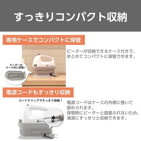 ■電源コードはケースの外側に巻いて留められます。保管時にビーターと直接ふれないため、清潔にすっきりと収納できます。