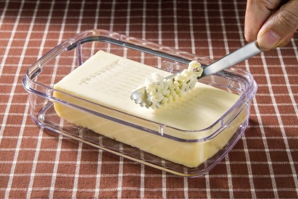 ○冷蔵庫の固いバターが「ふわふわ」に削れて塗り伸ばしやすいバターナイフとバターをしっかり保存できる密封バターケースのセット。