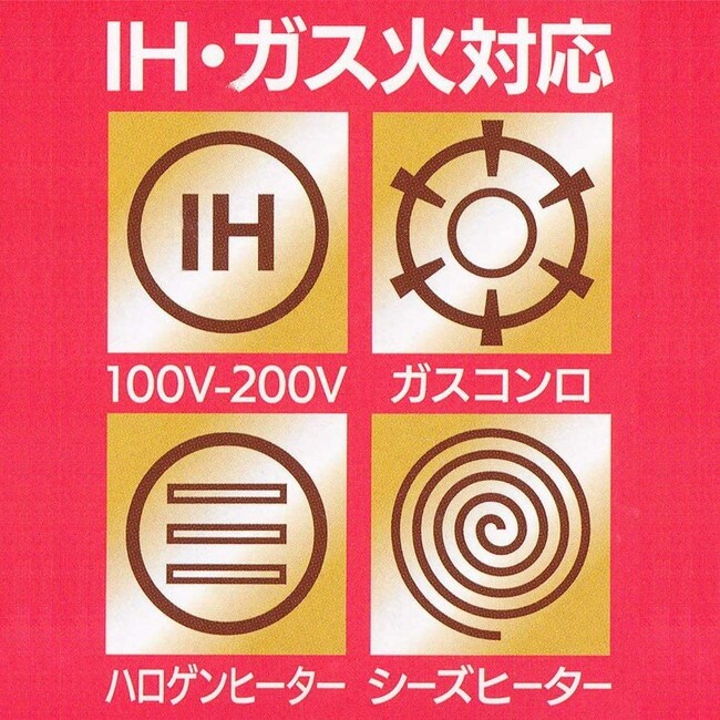 IH(100V-200V)、ガスコンロ、ハロゲンヒーター、シーズヒーター対応。