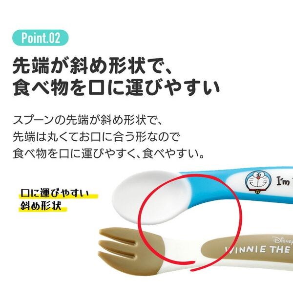 ・スプーンの先端が斜め形状のため、お子様が食べ物をを口に運びやすくなっています。