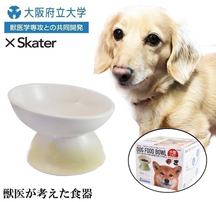 「大阪府立大学 獣医学専攻×スケーター株式会社の共同開発商品」ワンちゃんが楽な姿勢で食べやすい、獣医さんが考えた小型犬種用の陶器製食器。高さがあるので首・背中・腰・前足などへの負担を軽減し、食べ物の逆流などの予防、健康維持のためにもおすすめです。奥側が高くなっているのでフードがこぼれにくく、底がボウル上になっているのでフードが中央に集まって食べやすい。滑り止め・転倒・キズ防止のシリコーンマット付き。