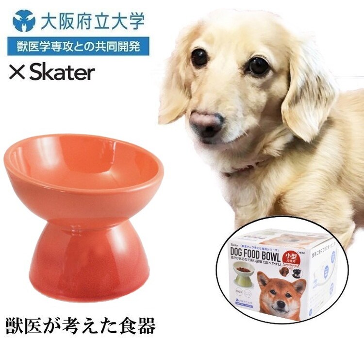 「大阪府立大学 獣医学専攻×スケーター株式会社の共同開発商品」ワンちゃんが楽な姿勢で食べやすい、獣医さんが考えた小型犬種用の陶器製食器。高さがあるので首・背中・腰・前足などへの負担を軽減し、食べ物の逆流などの予防、健康維持のためにもおすすめです。奥側が高くなっているのでフードがこぼれにくく、底がボウル上になっているのでフードが中央に集まって食べやすい。滑り止め・転倒・キズ防止のシリコーンマット付き。