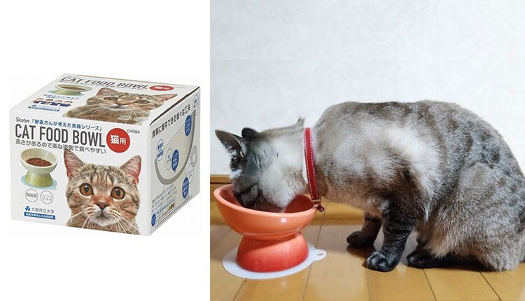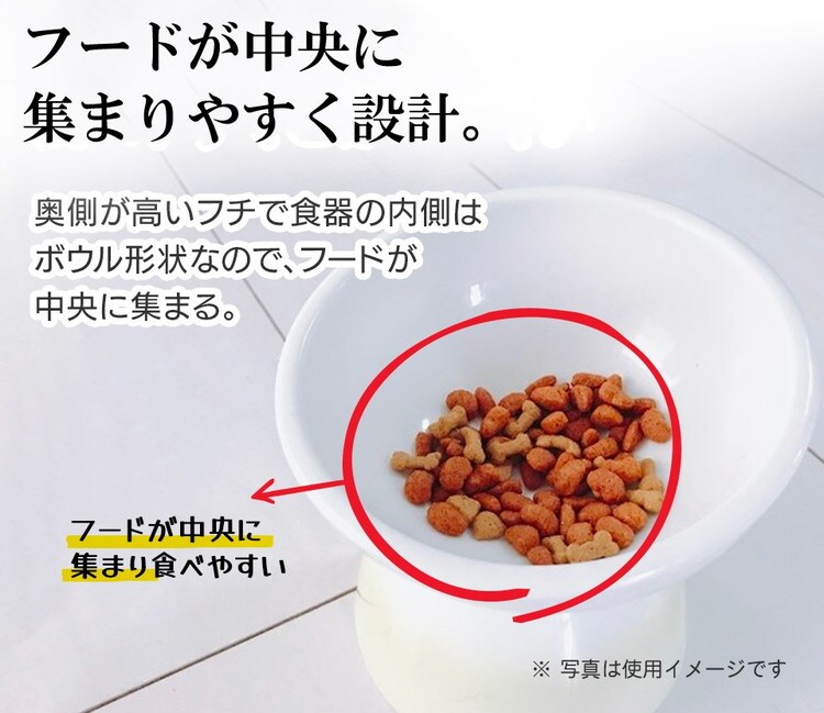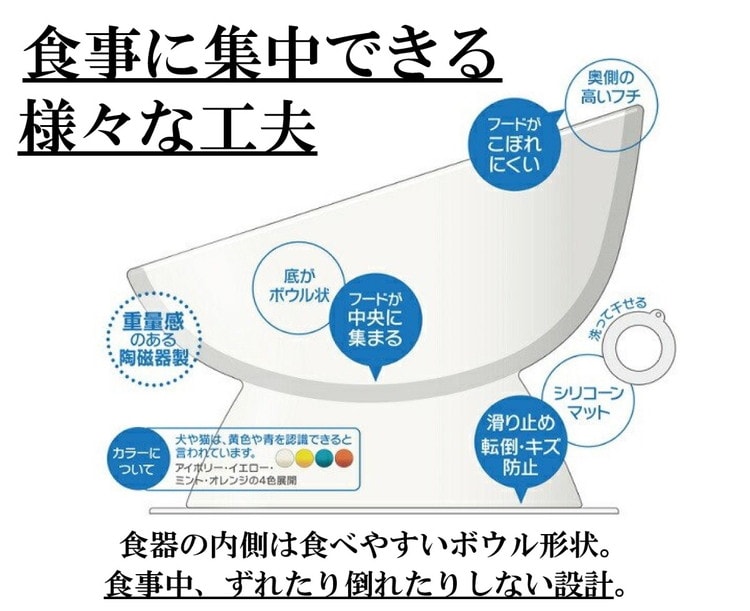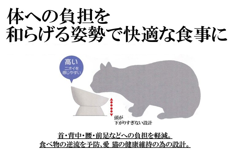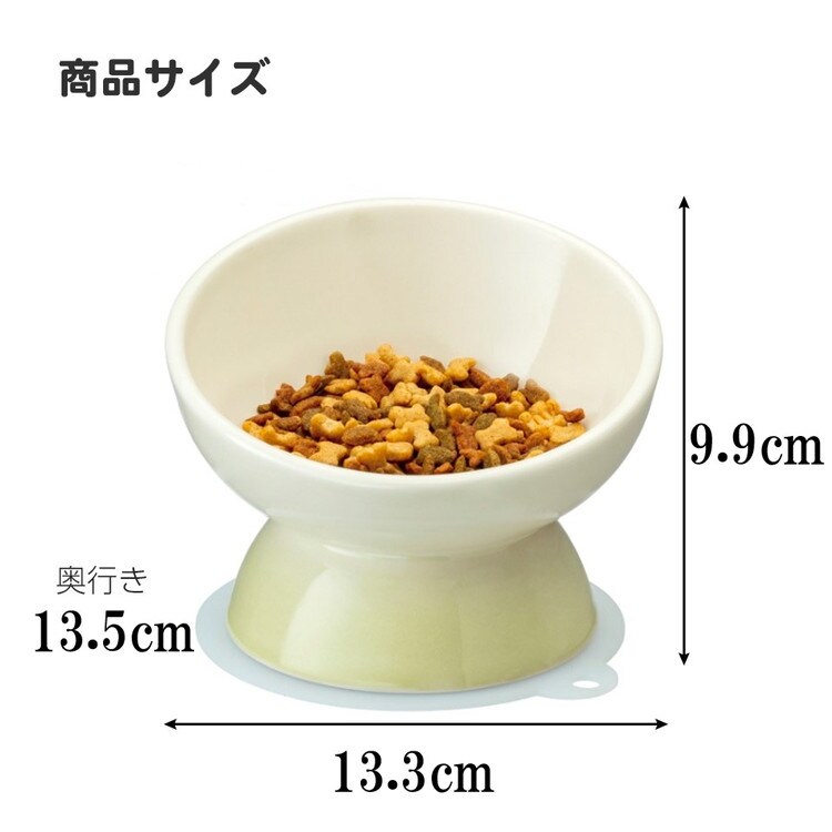 「大阪府立大学 獣医学専攻×スケーター株式会社の共同開発商品」ネコちゃんが楽な姿勢で食べやすい、獣医さんが考えた猫用の陶器製食器。高さがあるので首・背中・腰・前足などへの負担を軽減し、食べ物の逆流などの予防、健康維持のためにもおすすめです。奥側が高くなっているのでフードがこぼれにくく、底がボウル上になっているのでフードが中央に集まって食べやすい。滑り止め・転倒・キズ防止のシリコーンマット付き。