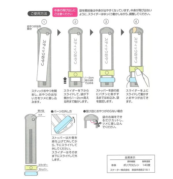 スティックおやつを本体にセットしてストッパーで袋を固定したら、片手でスライドするだけ!