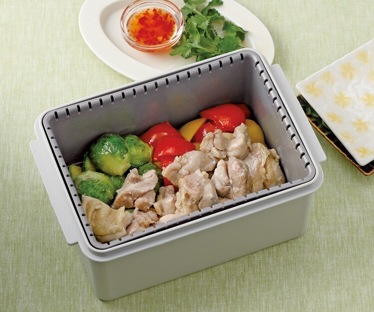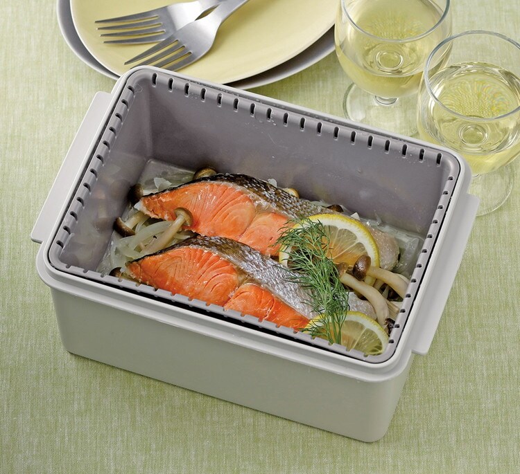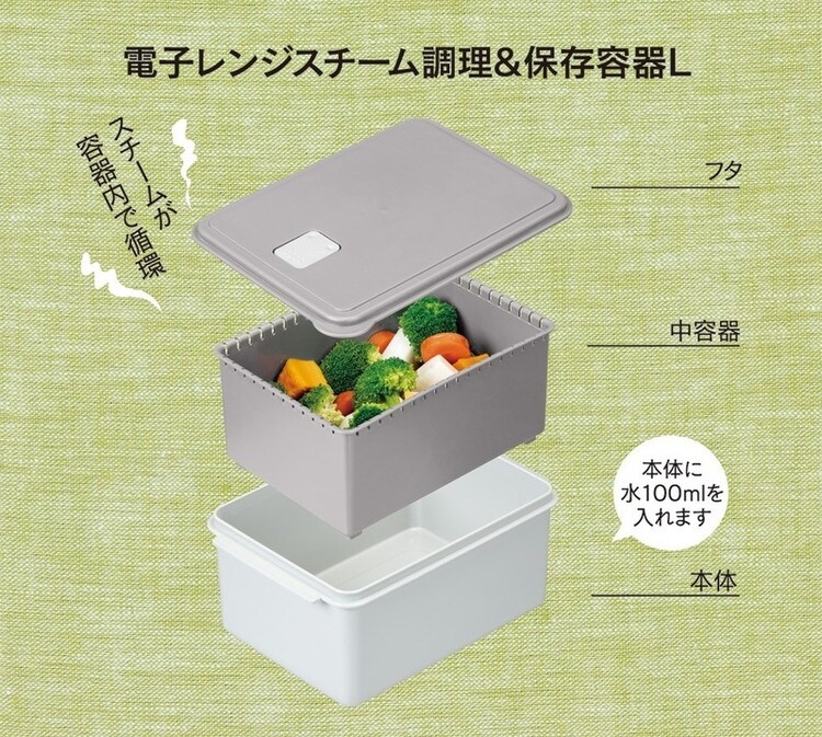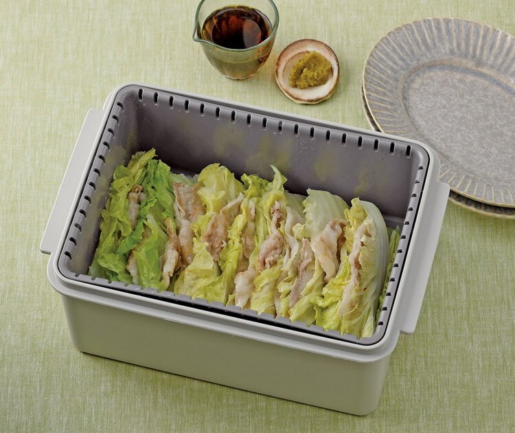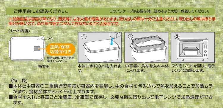※加熱直後は容器が熱くなり、蒸気等によるヤケドの危険があります。取り出しの際は十分にご注意ください。取り出しの際は持ち手部分が熱いので、ぬれ布巾等でつかんでお持ちいただくと安全です。