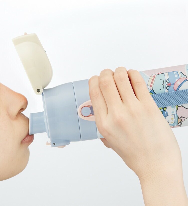 2種類ある飲み口を付け替えて、直接口を付けて飲めるダイレクト飲みタイプと、温かい飲み物もOKのコップ飲みタイプで使い分け!