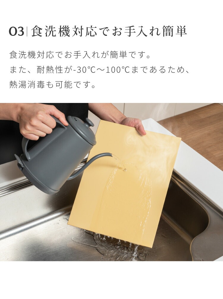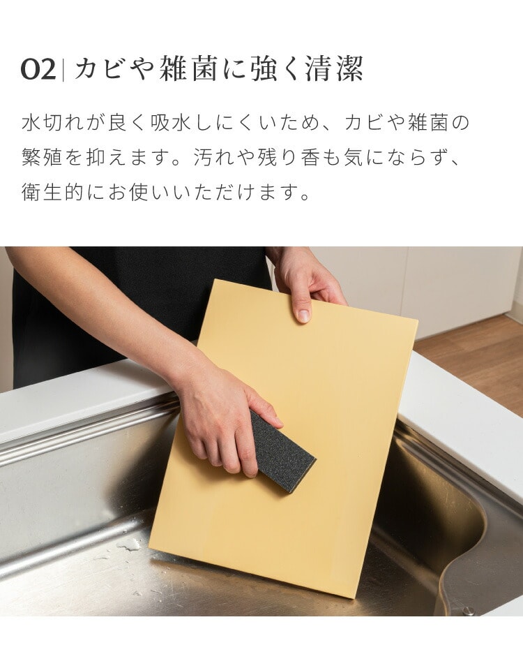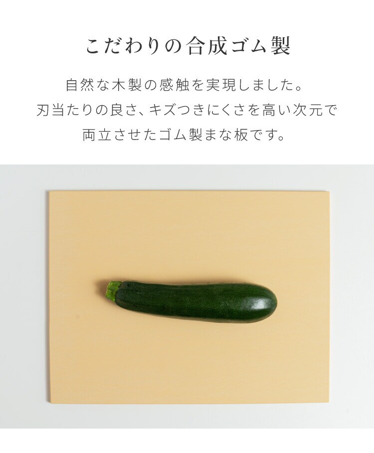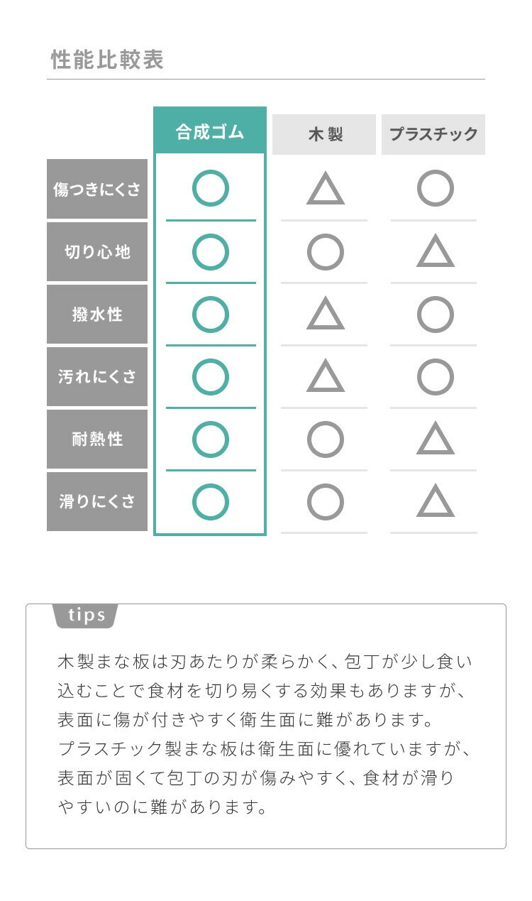 汚れ・臭いがつきにくい:合成ゴムは汚れが不着しにくいため、食材を切っても色移りがしにくく、臭い移りもしにくい素材です。