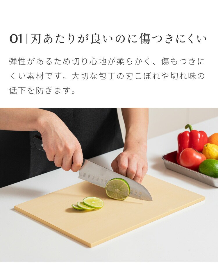 ソフトな刃当たり:刃当たりが柔らかいため、手首に負担がかかりにくく長時間の調理も楽にできます。また、素材が柔らかいため包丁の刃を傷めにくいです。