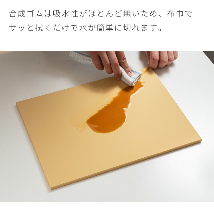 水切れが良い:合成ゴムは吸水性がほとんどないため、布巾でサッと拭くだけで水が簡単に切れます。また、水が簡単に切れるため衛生的です。