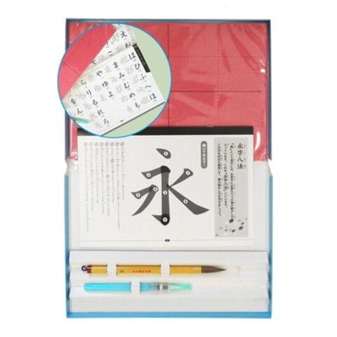 ●素材:太筆軸:ABS軸(抗菌軸)、羊毛・馬毛/水筆:PE、キャップ:PP、首軸:PP、ぺん先:PEs/お習字半紙:紙・顔料/お稽古の本:紙/個箱:ボール紙