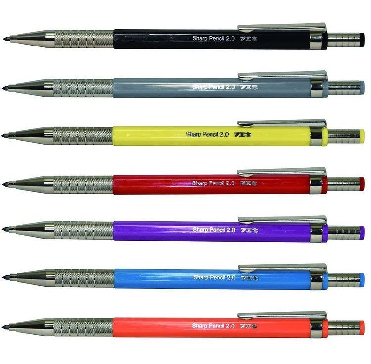 ●木材・コンクリートなどに滑らかに書ける、折れにくい2.0mm芯使用のシャープペンシル。●ノック部に芯削りを内蔵しています。●商品サイズ(約):W40×D10×H200mm●重量(約):15g日本不易糊工業赤