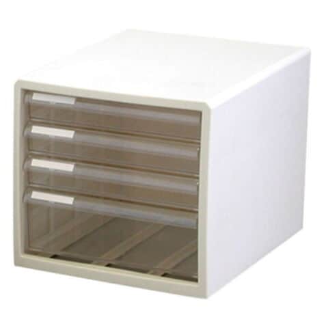 ●引出しは書類の整理に便利な浅型3段・深型1段があり、深型タイプはA4用紙も梱包ごと(500枚)収納でき、穴開けパンチや小型セロテープカッターなども入る高さです。