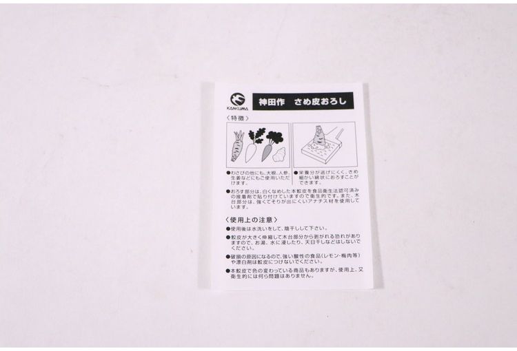 ●天然木製の持ち手と本鮫皮を使用したおろし器です。●商品サイズ(約):65x110mm●材質:天然木・本鮫皮