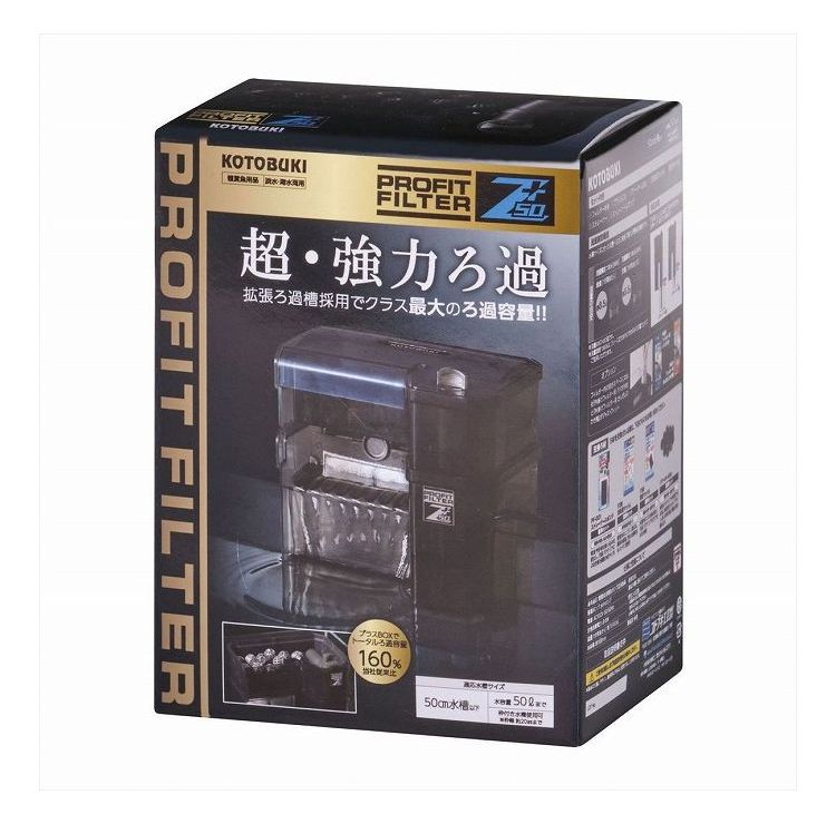 ●超・強力ろ過。●拡張ろ過槽採用でクラス最大のろ過容量!●外掛け式フィルターの新発想!「プラスBOX」●プラスBOXにパワーボールBioを標準セット。●従来の外掛け式フィルターでは不足しがちだった生物ろ過能力をアップ。●水位が半ドライ設定なので、バクテリアに酸素が供給されろ過がより活性化されます。●「パワーボールBio」標準セット!●多数のバクテリアが活着できるよう、表面積が大きくデザインされたパワーボールBio。●プラスBOXからの落下水により、フィルター内の溶存酸素量が上がり、ろ過バクテリアが活性化。●約7.5-8.5L/min流量調節可能。●適応水槽サイズ:小型水槽-50cm水槽●枠付き水槽使用可:枠幅約20mmまで●個装寸法(mm):W178×D128×H237●本体幅:168mm●セット内容:フィルターZ本体、水中ポンプ、プラスBOX、パワーボールBio、活性炭マットA、荒目マットB、ストレーナー、ストレーナースポンジ●定格消費電力(50/60Hz):8/6W●水容量:約50L