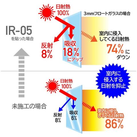 ●日射を反射・吸収する遮熱フィルムです。●透明で暗くならなりません。●紫外線を99%カットします。●ガラスが割れても破片が飛び散らない飛散防止フィルムです。●冷房効果アップが期待できる省エネフィルムです。●商品サイズ(約):460×900mm●厚み(約):50ミクロン●素材:PET●1.ガラスのサイズを測る 2.ガラスの掃除をする 3.ガラス面にしたたり落ちるくらいたっぷりと水溶液をスプレーし、フィルムを貼り付ける 4.ペーパータオルなどで軽く水分を拭き取ってください。