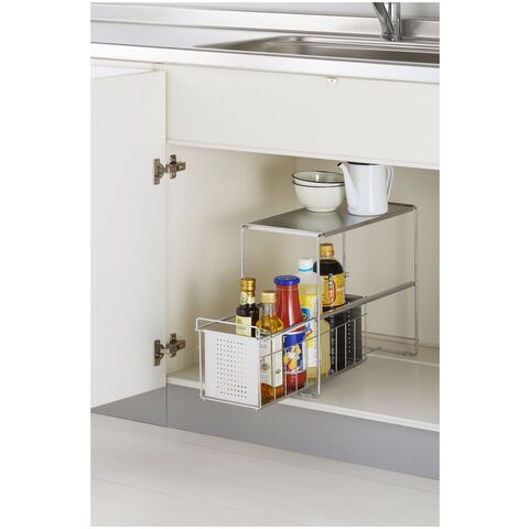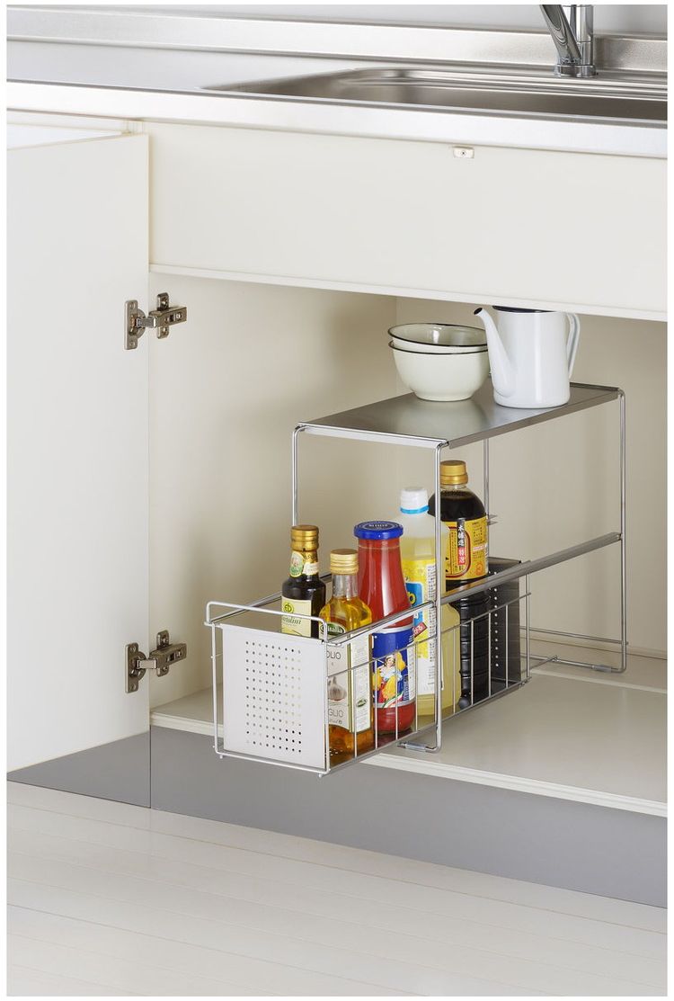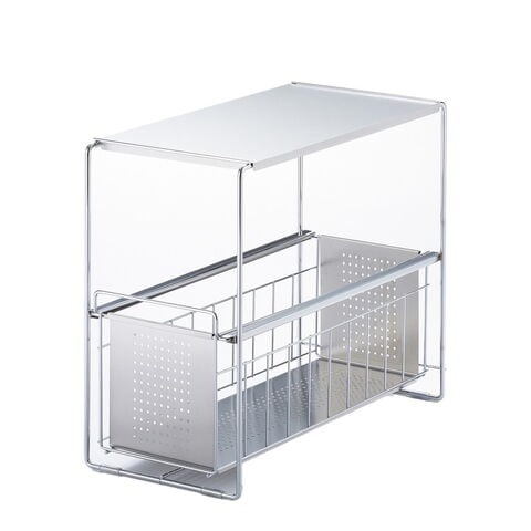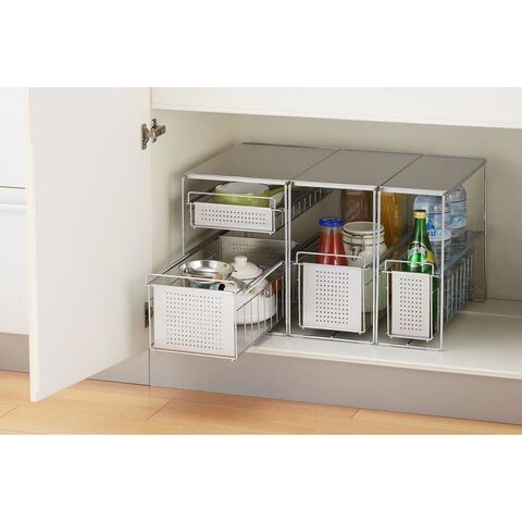 ●スライド式なので、奥の物も取り出しやすいです。●油や醤油などの調味料ボトルも並べてキレイに整理できます。●天板はフラットなのでラックの上も有効活用できます。●商品サイズ(約):縦200×横435×高さ352mm●パッケージサイズ(約):幅220×奥行450×高さ365mm●商品重量(約):2050g●パッケージ重量(約):2630g●材質:本体・カゴ・浅カゴ/スチール(クロムメッキ)、天板・カゴ板・浅用カゴ板/ステンレス、スライド用チューブ/特殊ポリエチレン、脚ゴム/シリコーンゴム