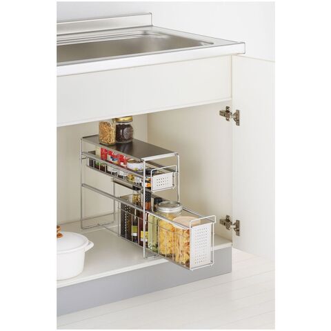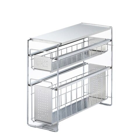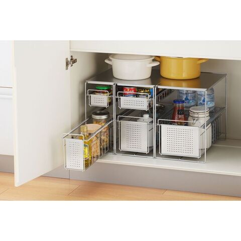 ●スライド式なので、奥の物も取り出しやすいです。●油や醤油などの調味料ボトルも並べてキレイに整理できます。●天板はフラットなのでラックの上も有効活用できます。●商品サイズ(約):縦155×横435×高さ355mm●パッケージサイズ(約):幅170×奥行450×高さ370mm●商品重量(約):2590g●パッケージ重量(約):3100g●材質:本体・カゴ・浅カゴ/スチール(クロムメッキ)、天板・カゴ板・浅用カゴ板/ステンレス、スライド用チューブ/特殊ポリエチレン、脚ゴム/シリコーンゴム