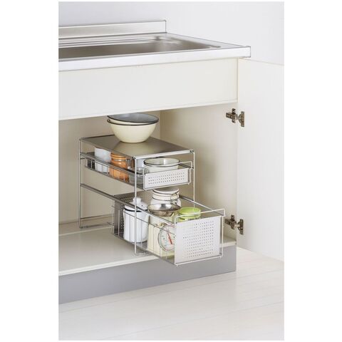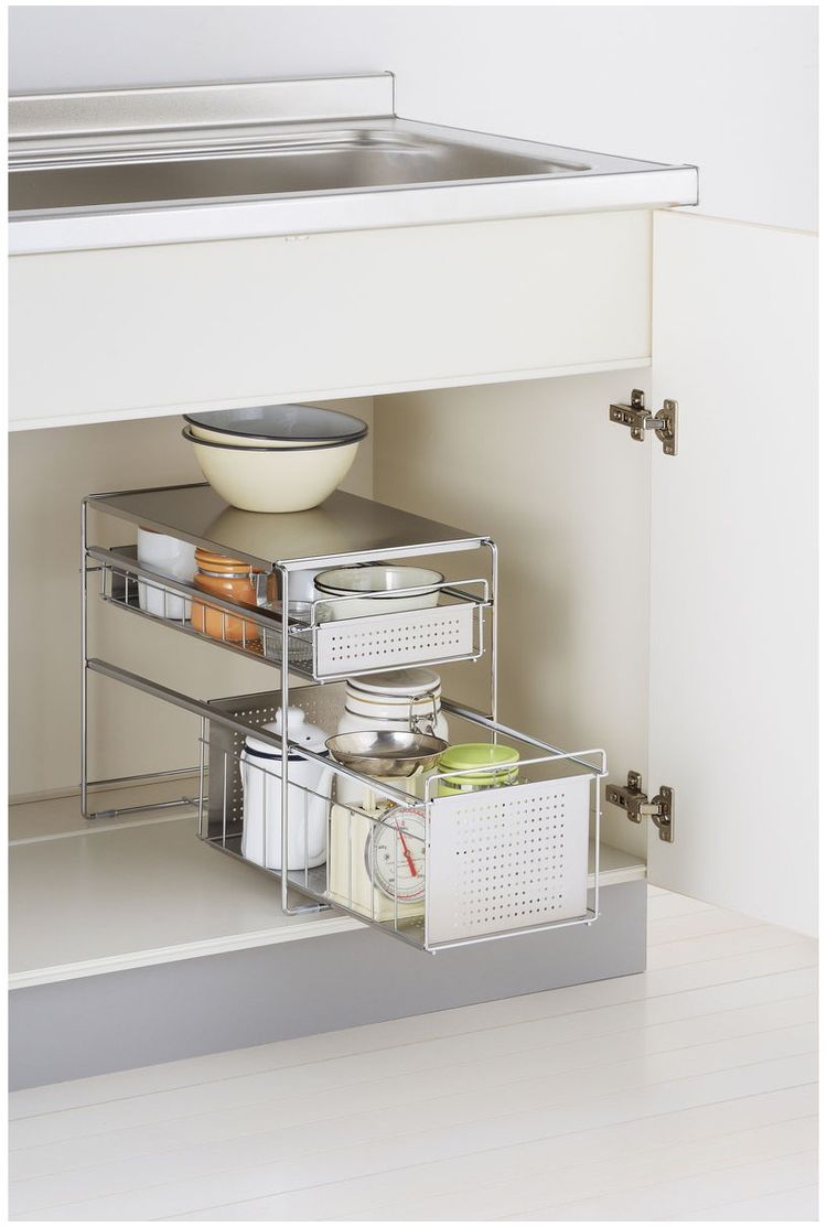 ●スライド式なので、奥の物も取り出しやすいです。●油や醤油などの調味料ボトルも並べてキレイに整理できます。●天板はフラットなのでラックの上も有効活用できます。●天板に鍋なども置けます。●商品サイズ(約):縦255×横435×高さ355mm●パッケージサイズ(約):幅270×奥行450×高さ370mm●商品重量(約):3290g●パッケージ重量(約):3800g●材質:本体・カゴ・浅カゴ/スチール(クロムメッキ)、天板・カゴ板・浅用カゴ板/ステンレス、スライド用チューブ/特殊ポリエチレン、脚ゴム/シリコーンゴム