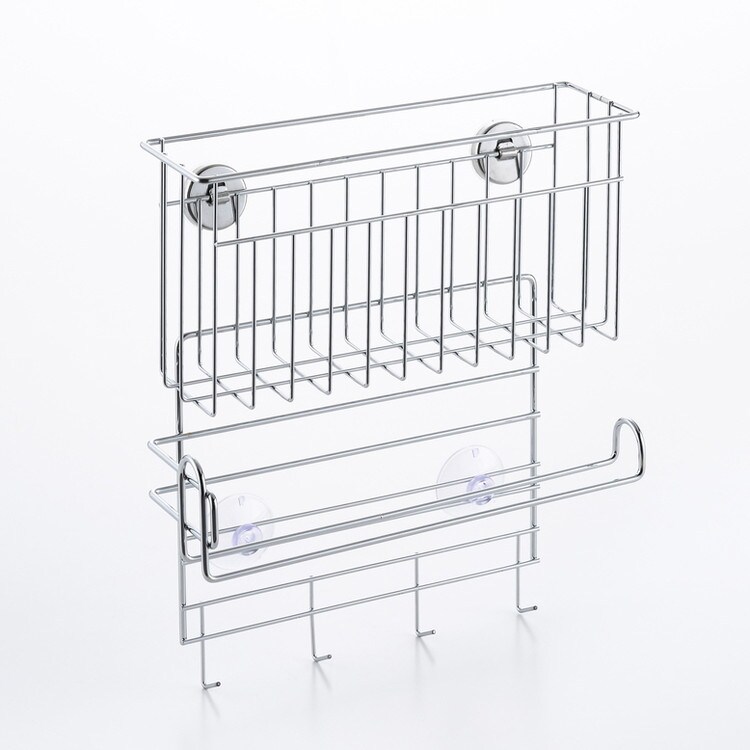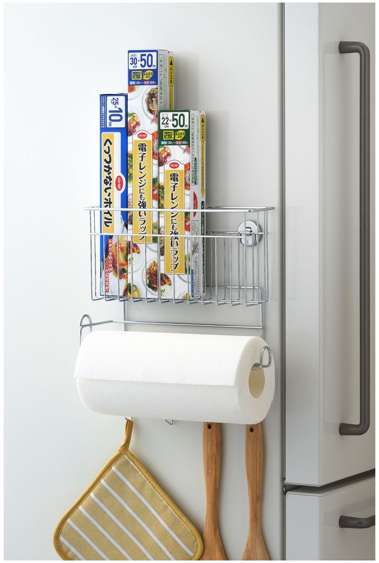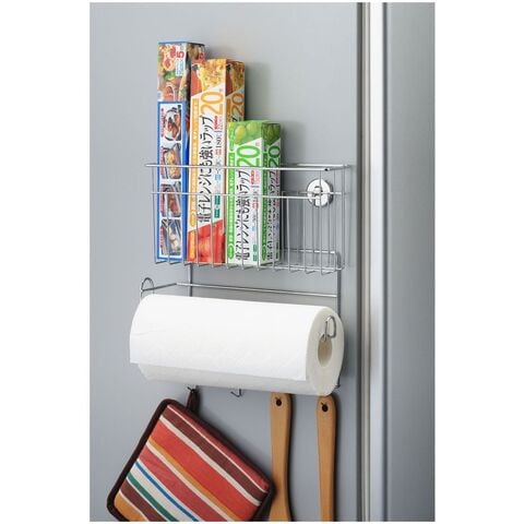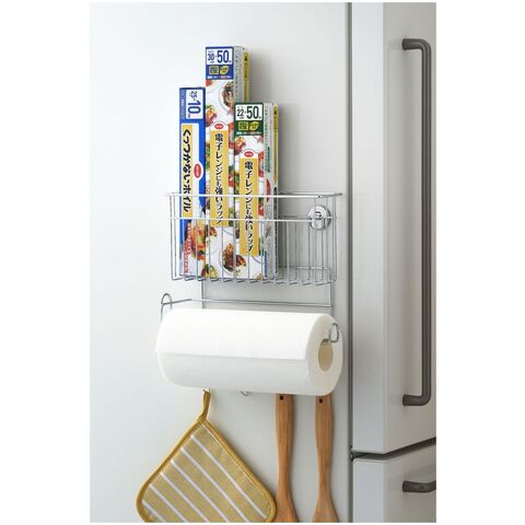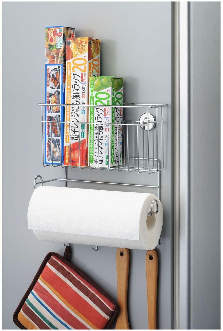 ●冷蔵庫横などにマグネットと吸盤で取り付け、ラップやアルミホイル、キッチンペーパー、小物をまとめて収納できるホルダー。