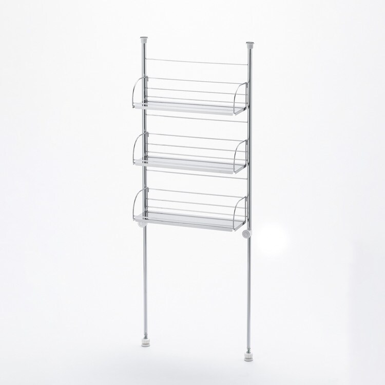 ●壁面空間を収納スペースに利用できます。●突っ張り式なので場所を取らずに収納可能です。●商品サイズ(約):縦400×横150×高さ710~1100mm●パッケージサイズ(約):幅450×奥行720×高さ170mm●商品重量(約):2600g●パッケージ重量(約):3500g●材質:本体フレーム・棚枠/スチール(クロムメッキ)、棚板/ステンレス、固定ツマミ/ABS樹脂
