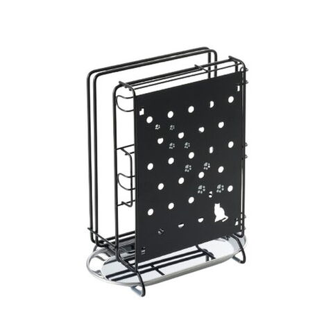 ●かわいい猫と足あとシルエットのプレートが包丁の刃先をオシャレに目隠ししてくれます。●キッチンバサミ、シートまな板の専用スペースもあります。●取り外しできる水受けトレー付きです。●商品サイズ(約):縦152×横102×高さ217mm●商品重量(約):410g●材質:本体/スチール(カチオン電着塗装+ポリエステル樹脂粉体塗装)、トレイ/ステンレス、クッションチューブ/シリコンゴム