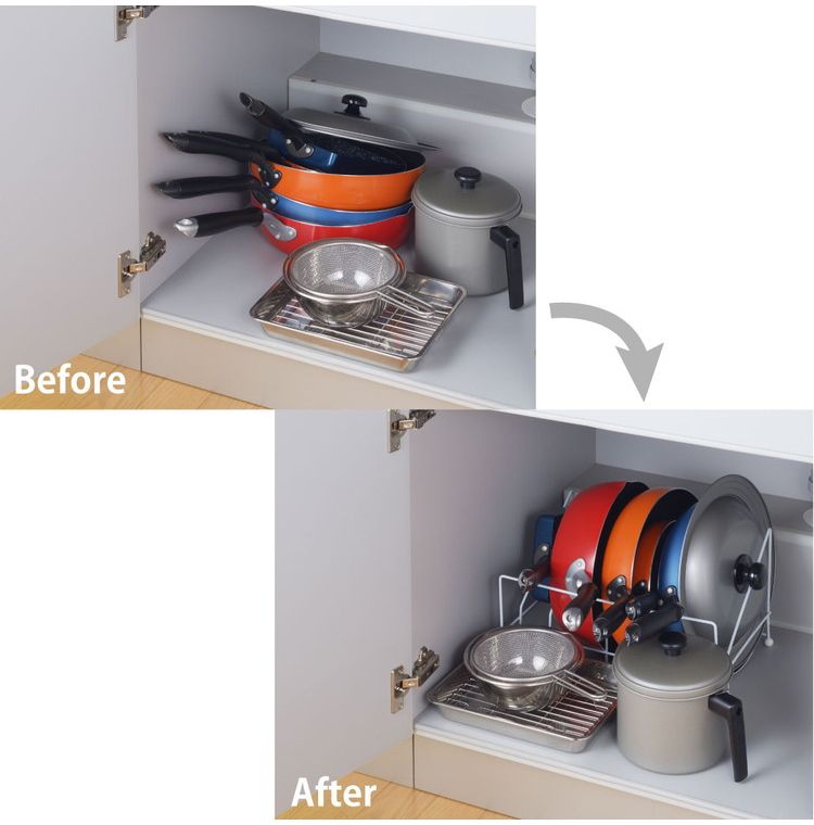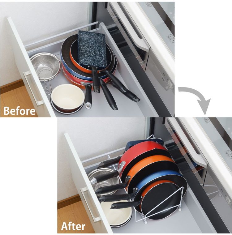 ●散らかりがちなシンクやコンロ下のフライパンをスッキリ収納。