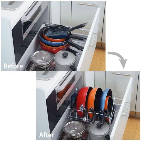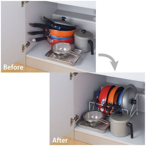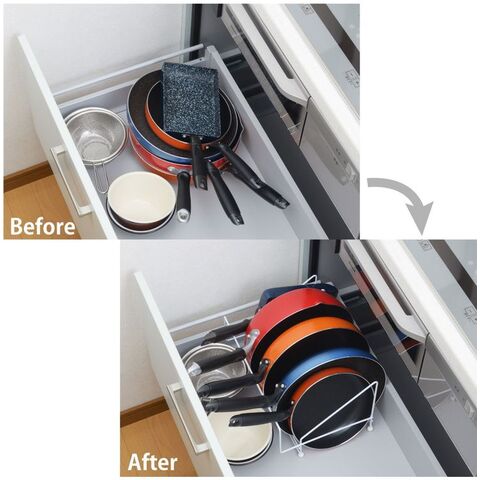 ●立てて収納するので、使いたいサイズの取り出しも簡単に行えます。●取っ手部を浮かせて収納するので、取り出しやすく、スペースも有効活用できます。●玉子焼きやガラス蓋も収納できます。●組み立て不要で安定性もある固定式です。●商品サイズ(約):縦235×横340×高さ202mm●商品重量(約):280g●材質:本体/スチール(ポリエチレンコーティング)、脚ゴム/シリコーンゴム