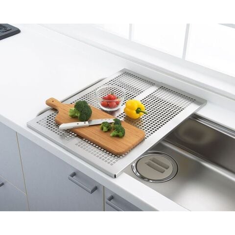 ●必要なときだけ広げればシンク上が水切り・作業台に 早変わりします。●商品サイズ(約):縦/229mm、横/567mm、高さ/15mm●パッケージサイズ(約):幅/587mm、奥行/240mm、高さ/32mm●商品重量(約):1330g●パッケージ重量(約):1500g●材質:本体/ステンレス、クッションゴム/合成ゴム