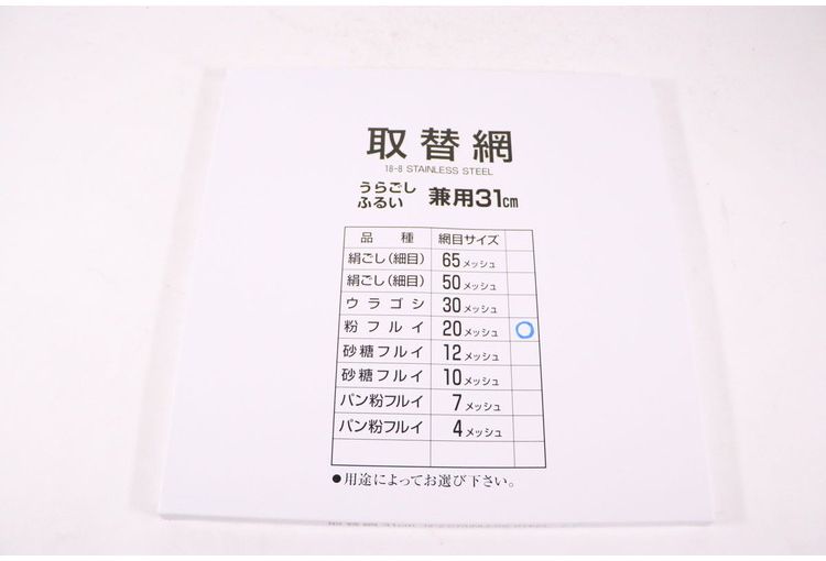 ●メッシュとは、【例】20メッシュ(荒目)の場合、1インチ(2.54cm)角に縦20・横20の目があります。●材質:18-8ステンレス