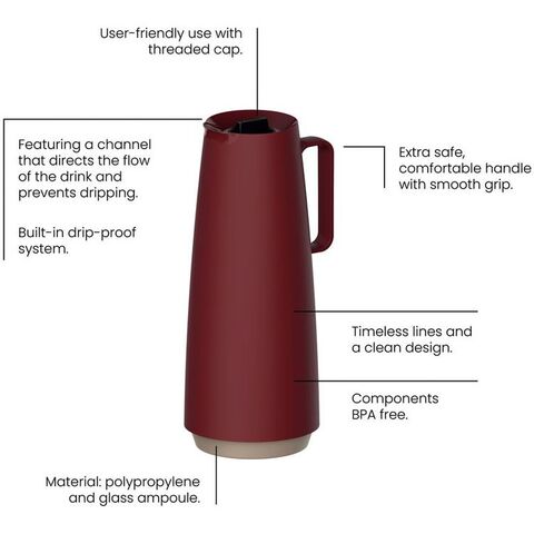 ●ガラスライナー付きのプラスチック製で、保温・保冷にも使えます。●冷たいものは、12時間の保冷、温かいものはスタートが90℃の時、12時間後70℃の保温力。●水流を整えることで湯漏れしにくい溝付き構造。●滑らかなグリップを備えたハンドルは安全性にも優れ、快適にご使用いただけます。●スタイリッシュなフォルム。●トレンド感のあるカラーバリエーション。●BPAフリー。●商品サイズ(約):径120mm、高さ293mm、幅140mm●商品重量(約):500g●容量:1L●材質:ポリプロピレン、ガラス●カラー:レッド