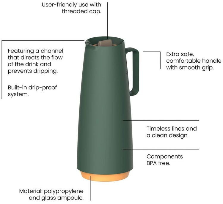 ●ガラスライナー付きのプラスチック製で、保温・保冷にも使えます。●冷たいものは、12時間の保冷、温かいものはスタートが90℃の時、12時間後70℃の保温力。●水流を整えることで湯漏れしにくい溝付き構造。●滑らかなグリップを備えたハンドルは安全性にも優れ、快適にご使用いただけます。●スタイリッシュなフォルム。●トレンド感のあるカラーバリエーション。●BPAフリー。●商品サイズ(約):径120mm、高さ293mm、幅140mm●商品重量(約):500g●容量:1L●材質:ポリプロピレン、ガラス●カラー:グリーン