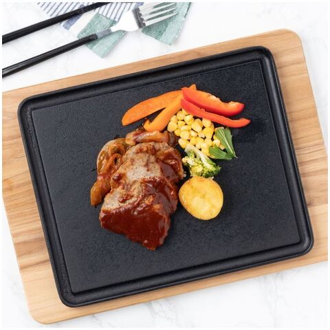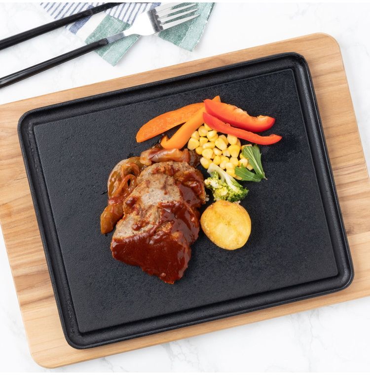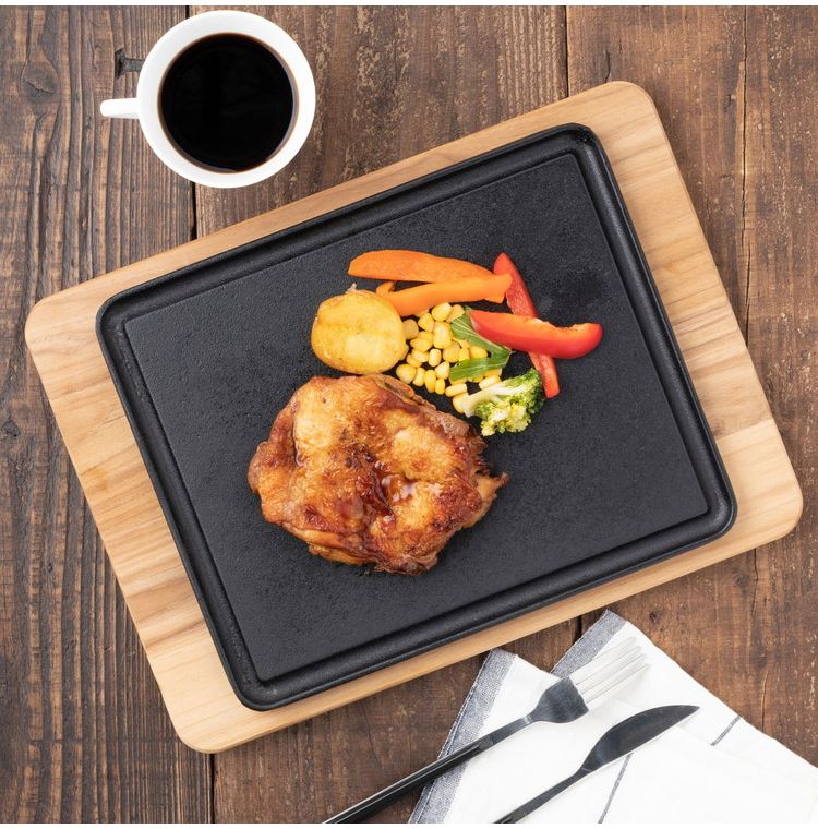 ●バーベキューにも、ご家庭の本格お肉調理用にも最適なアイテムです。●チーク材を使用したボード。自然で優しい色合いです。●商品サイズ(約):350×255×18mm、鉄板/280×230mm●商品重量(約):1984g●材質:チーク材