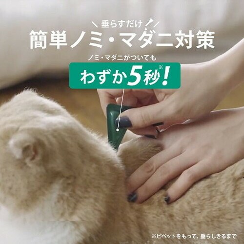 8週齢以上の猫の肩甲骨間背部の被毛を分け、皮膚上の1部位にピペット全量を滴下する。