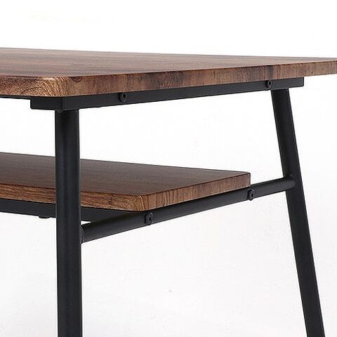 木目調の天板とスチール脚の組み合わせがオシャレなテーブルです。天板下の棚には雑誌やリモコンなどを置くことができるので机上を広く使用することができます。天板は角に丸みをもたせた優しいデザインです。脚はアジャスター付きなので気になるガタツキを調節できます。