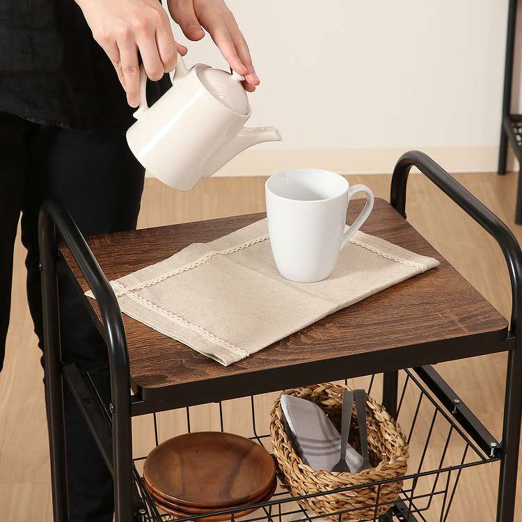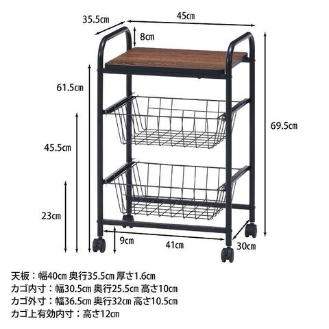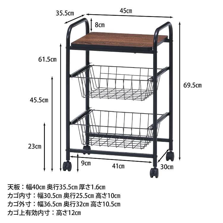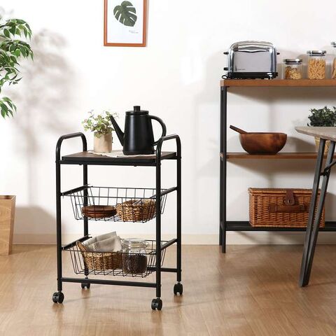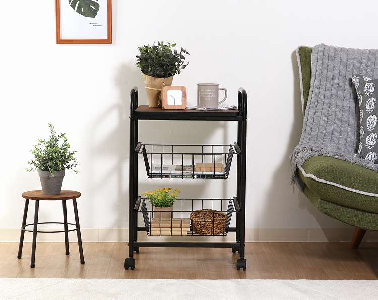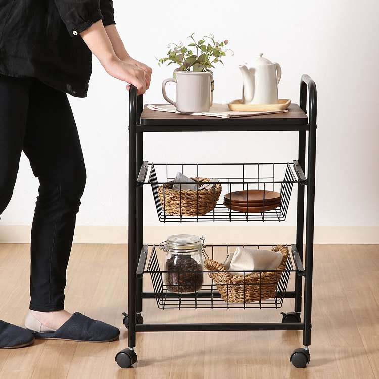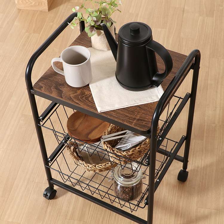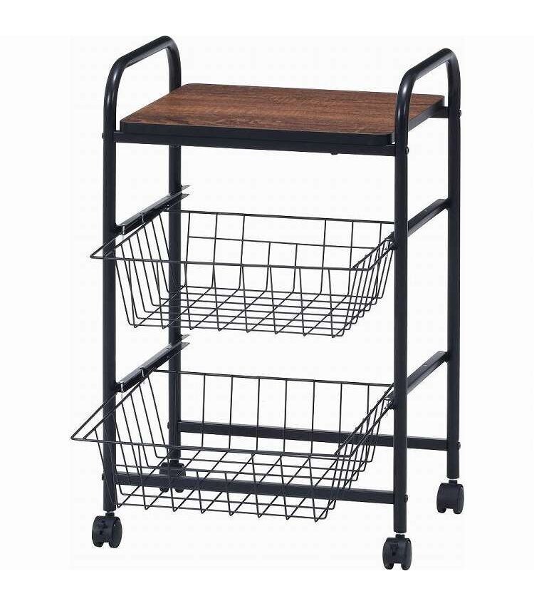 コロコロ動くコンパクトなキッチンワゴン調味料からカトラリーまで様々なものを収納できます。木目調天板とスチールの組み合わせでお洒落なデザインです。スライド式のバスケットが2杯付いています。高さも十分にあるので使い勝手は抜群。バスケットの上に厚さ9mmのパーティクルボードを設置。木目があることでお部屋に温かみを演出してくれます。幅40×奥行35.5cmの天板は、フラットな作りなので、ちょっとした作業台として使えます。キャスター付きなので、移動はらくらく。キッチン回りに、ダイニングの横に、使いたい場所に移動できます。移動させない時は2個所のキャスターに付いているストッパーで固定。天板で作業する時など安全です。