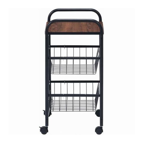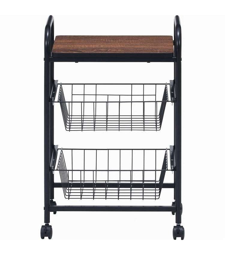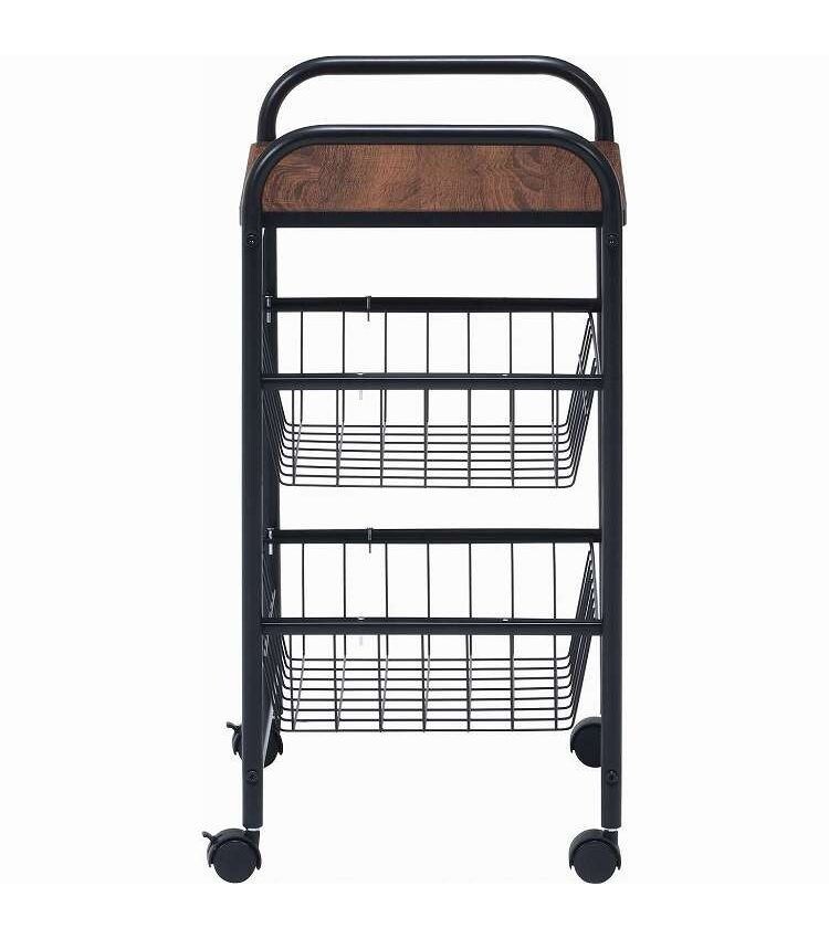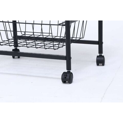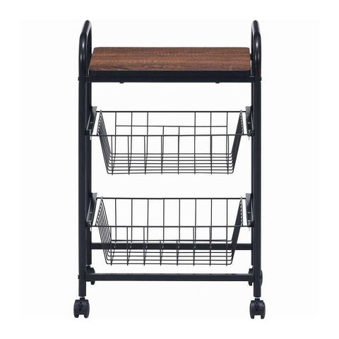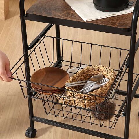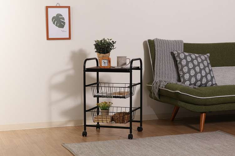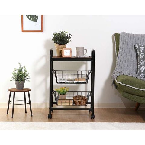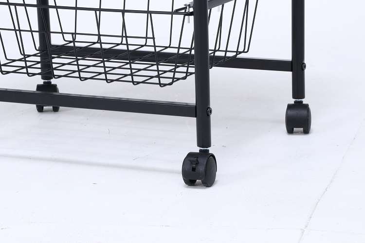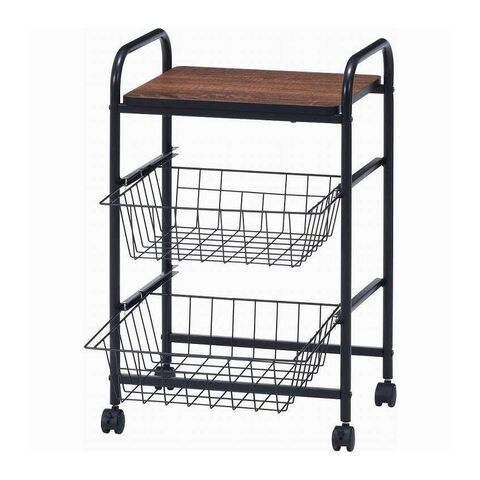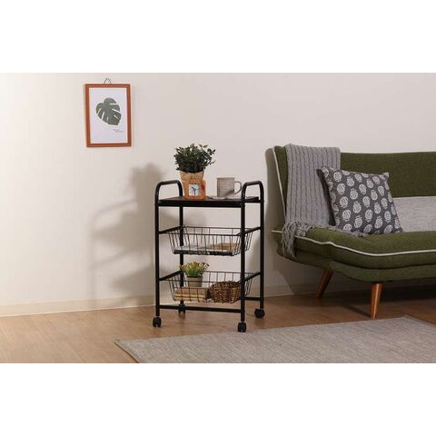 コロコロ動くコンパクトなキッチンワゴン調味料からカトラリーまで様々なものを収納できます。木目調天板とスチールの組み合わせでお洒落なデザインです。スライド式のバスケットが2杯付いています。高さも十分にあるので使い勝手は抜群。バスケットの上に厚さ9mmのパーティクルボードを設置。木目があることでお部屋に温かみを演出してくれます。幅40×奥行35.5cmの天板は、フラットな作りなので、ちょっとした作業台として使えます。キャスター付きなので、移動はらくらく。キッチン回りに、ダイニングの横に、使いたい場所に移動できます。移動させない時は2個所のキャスターに付いているストッパーで固定。天板で作業する時など安全です。