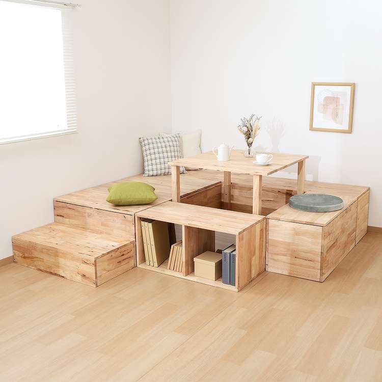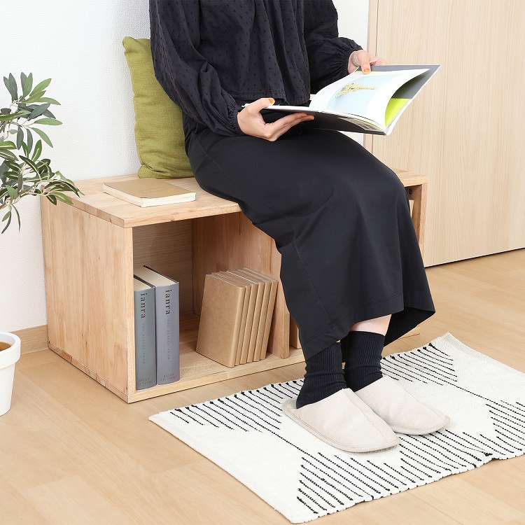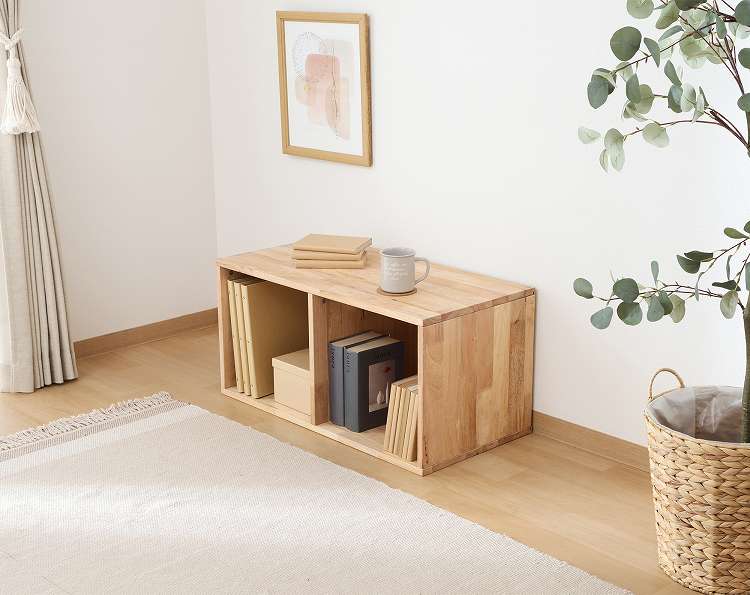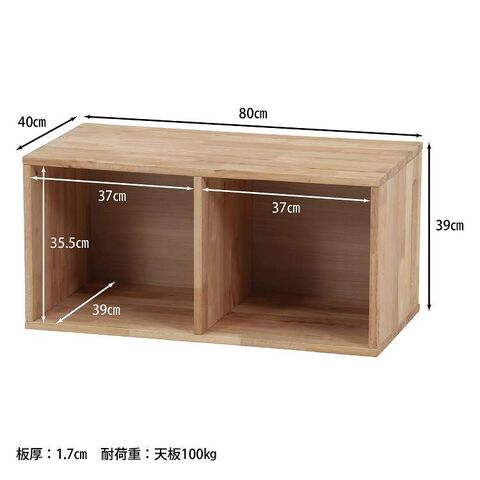 自由に組み合わせて新たな空間を作るTATAMIシリーズ オープンシェルフ天然木の木目や節といった個性をそのまま活かしたデザインです。扉がないため物の出し入れがしやすく、ボックスを使った収納アレンジも可能です。高さもちょうどよく耐荷重もしっかりとしているので、テレビ台としてもお使いいただけます。内寸は1マス幅37×奥行39×高さ35.5cmで、大きなサイズの絵本や雑誌もスッキリ収納できます。耐荷重は100kgなので、大人の男性も気にせずゆったり座れます。別売りのTATAMIシリーズと合わせてスキップフロアや掘りごたつなどを作ることができます。