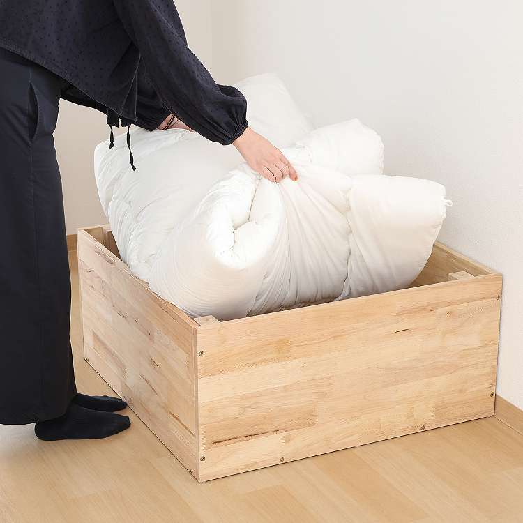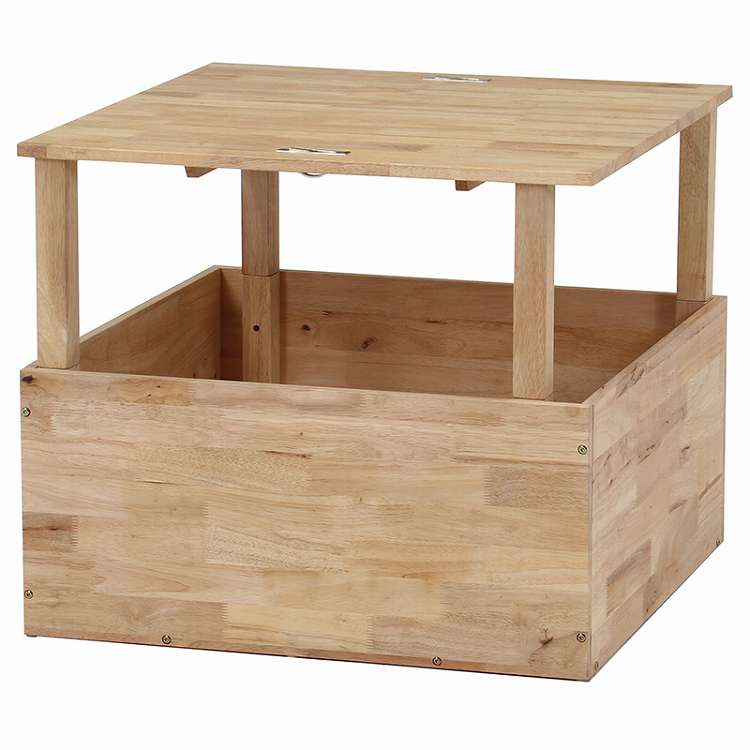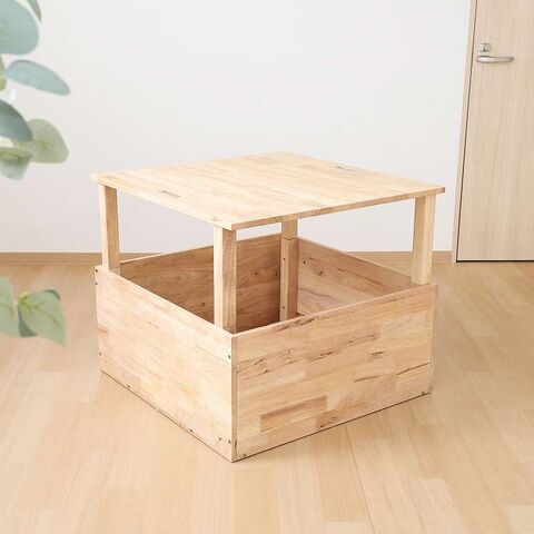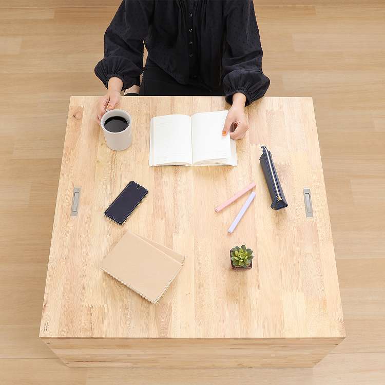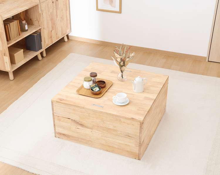 自由に組み合わせて新たな空間を作るTATAMIシリーズ センターテーブル天然木の木目や節といった個性をそのまま活かしたデザインです。幅80×奥行80cmで食事やパソコンを広げての作業も可能です。天板の下は収納スペースになっており、ブランケットなどのかさばるの大きな物も収納できます。天板には回転取っ手が付いています。しっかり力が入るので天板も引き上げやすく、普段の見た目はスッキリ。天板を閉めたときの耐荷重は100kgなので、大人の男性も気にせずゆったり座れます。別売りのTATAMIシリーズと合わせてスキップフロアや掘りごたつなどを作ることができます。