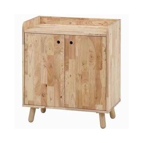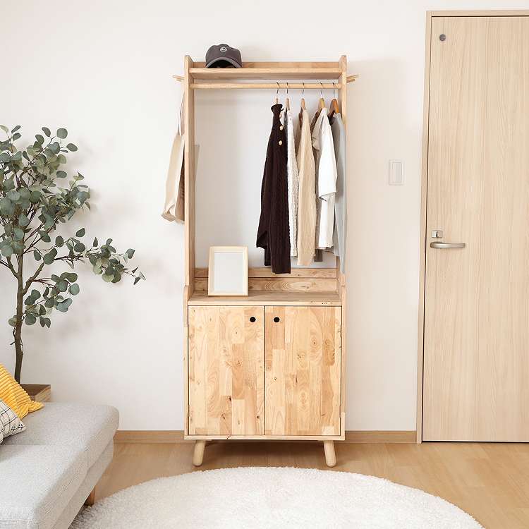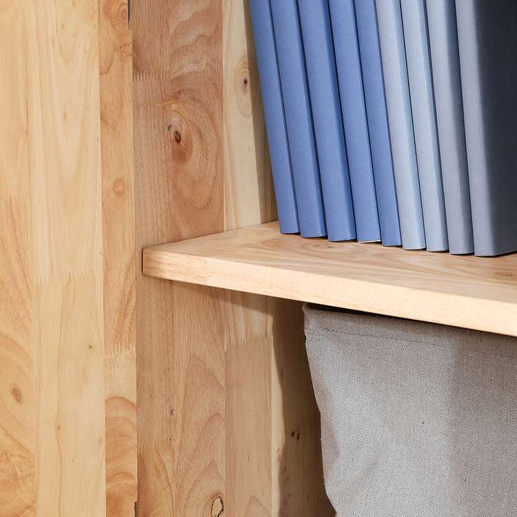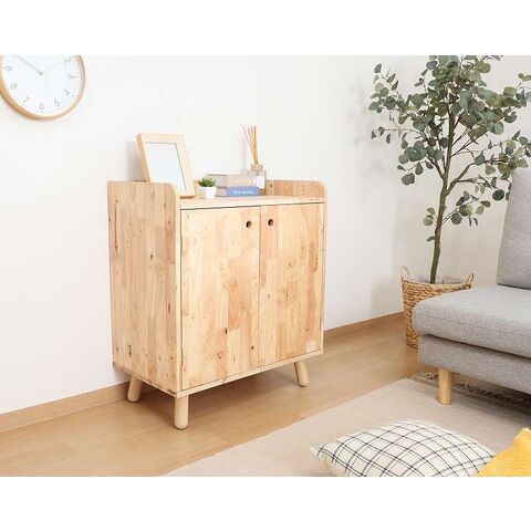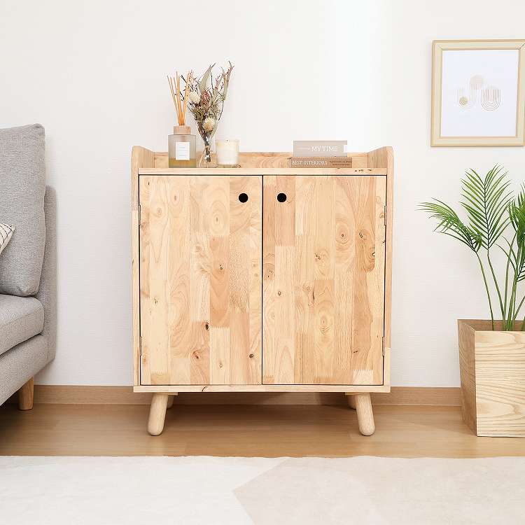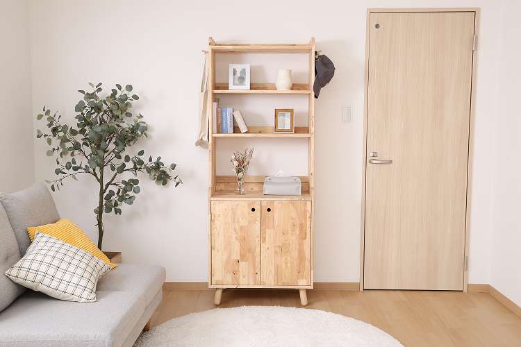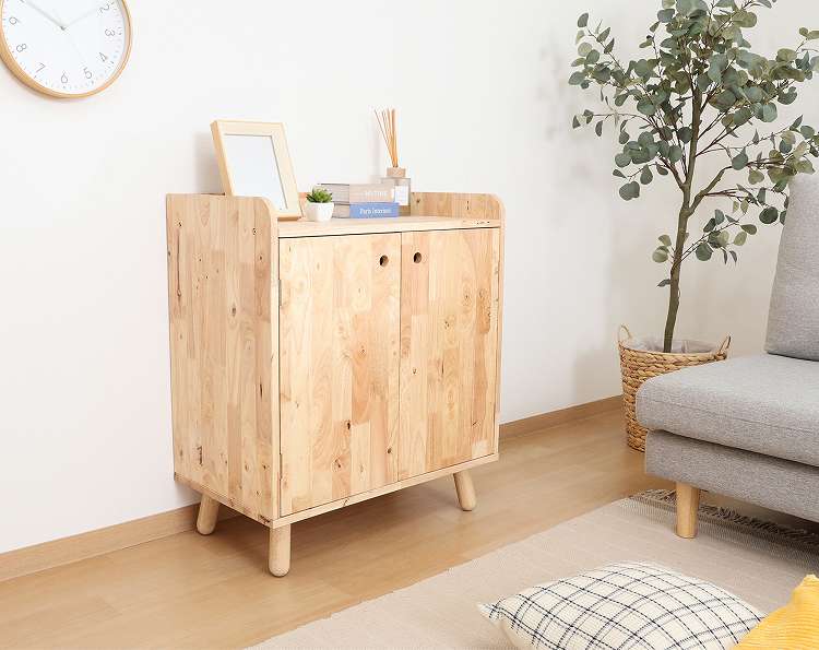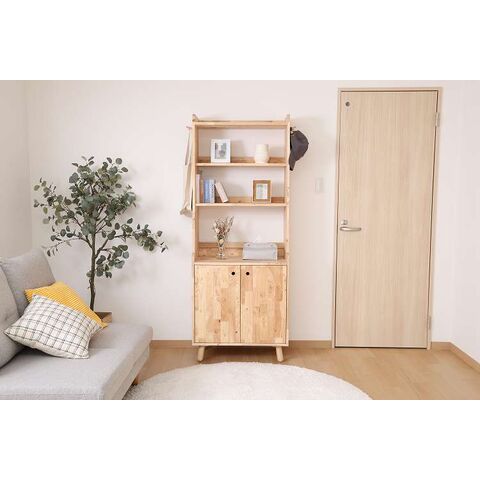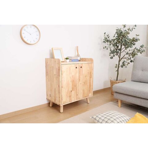 天然木の温かみが広がる壁面収納ユニットシリーズ 扉付きボトムキャビネット天然木の木目や節といった個性をそのまま活かしたデザインです。横板は丸みを帯びており、優しい印象を与えます。見た目もスッキリな扉収納なので、書類や見せたくないものをドサッと収納できます。棚板ピッチは90mmで高さを3段階で調節できる可動式。収納したい物に合わせて高さを決めることができます。高さ80cmと子どもでも使いやすく、お部屋に置いても圧迫感を感じにくい大きさです。棚下13.5cmあるので、柄の長い掃除用品やロボット掃除機も通れます。ホコリが溜まりやすい部分をキレイに保つことができます。別売りのトップラックと合わせて収納を拡張できます。