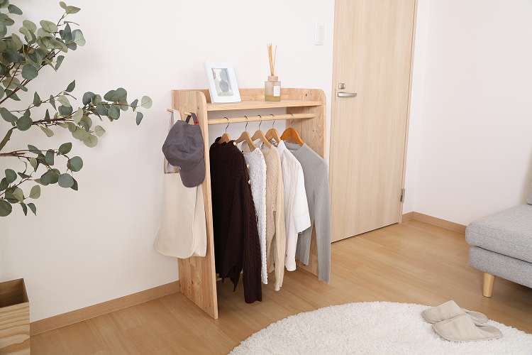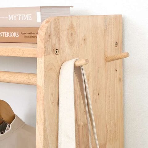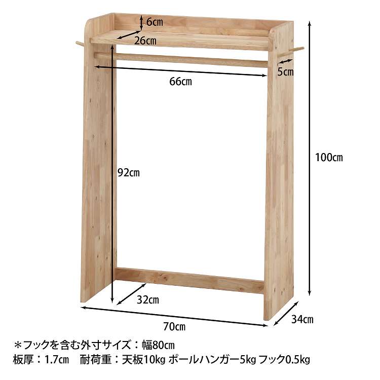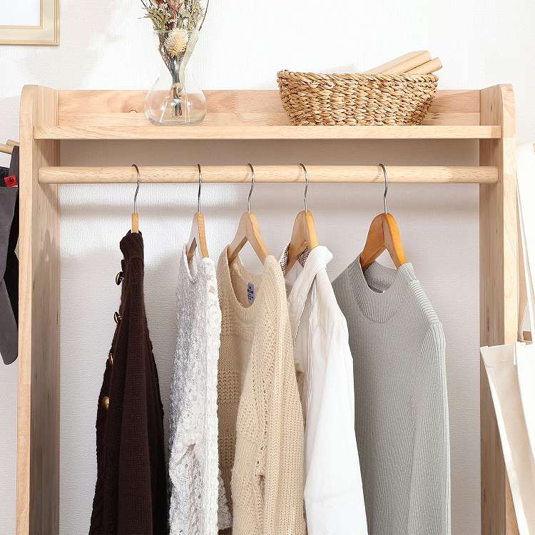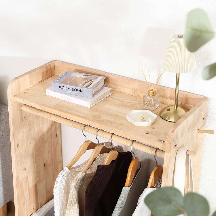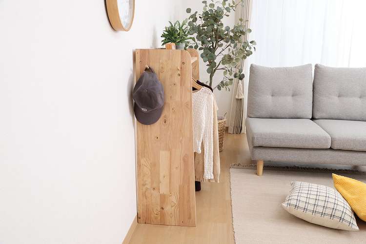 天然木の温かみが広がる壁面収納ユニットシリーズ ハンガーラック天然木の木目や節といった個性をそのまま活かしたデザインです。横板は丸みを帯びており、優しい印象を与えます。幅66cmのハンガーラックは耐荷重5kg。サッと取り出せて朝の支度にも便利です。天板にはお気に入りの雑貨を飾って、魅せる収納を楽しめます。ラック側面にはバッグや帽子などを引っ掛けられるフックが付いています。高さ100cmと子どもでも使いやすく、お部屋に置いても圧迫感を感じにくい大きさです。別売りのボトムラックと合わせて収納を拡張できます。