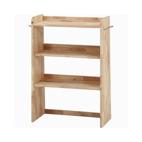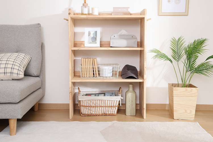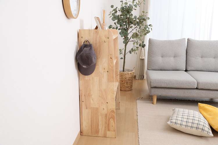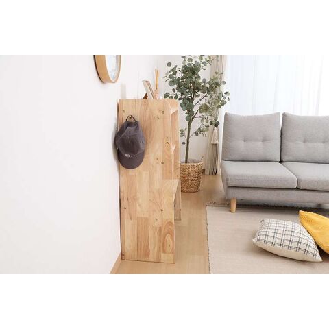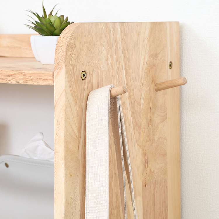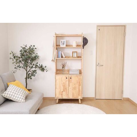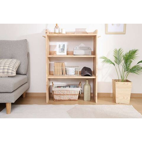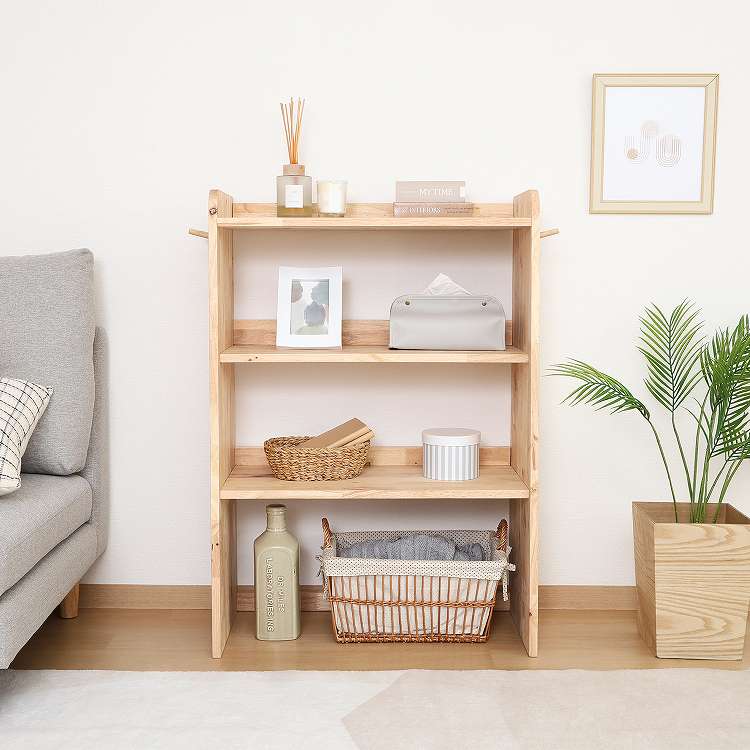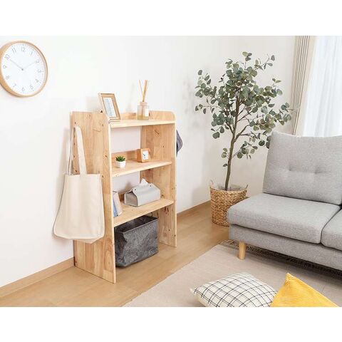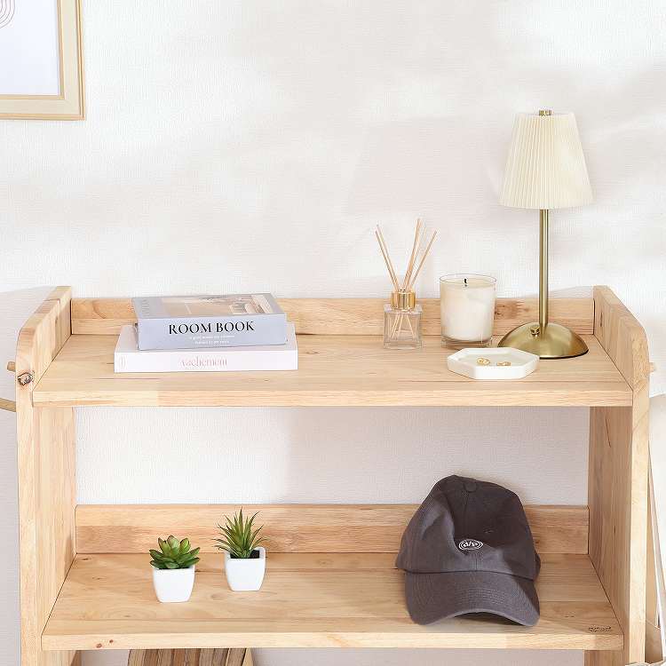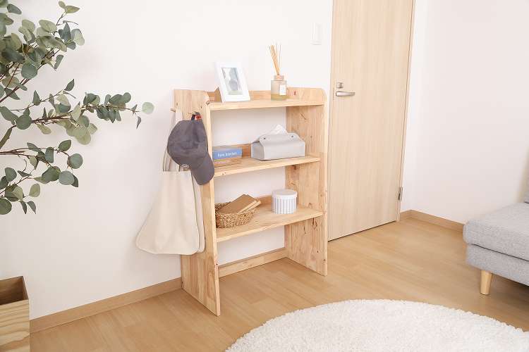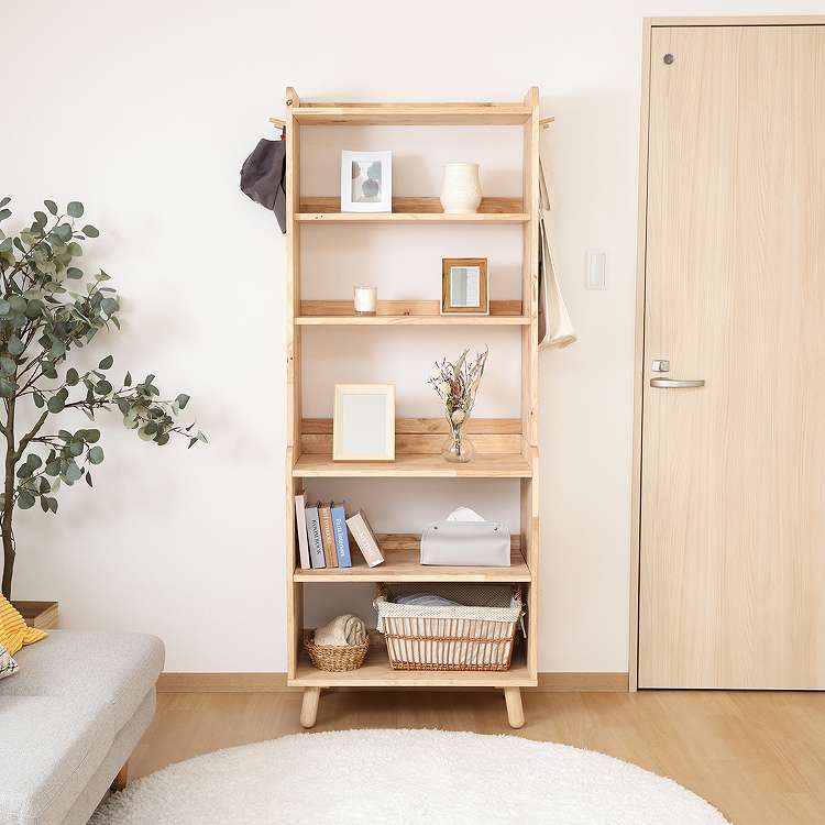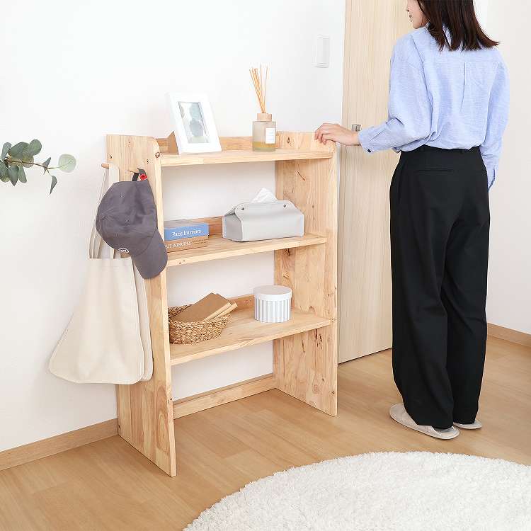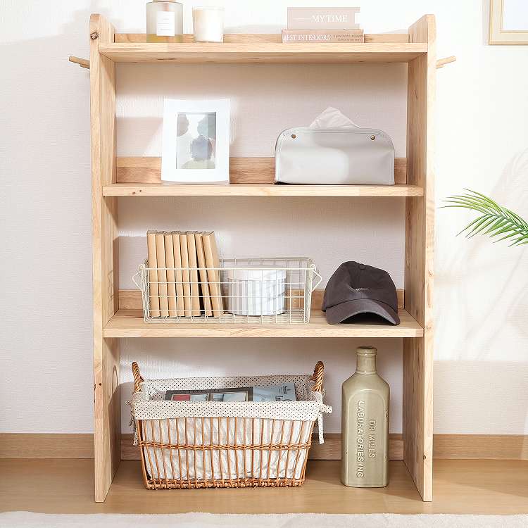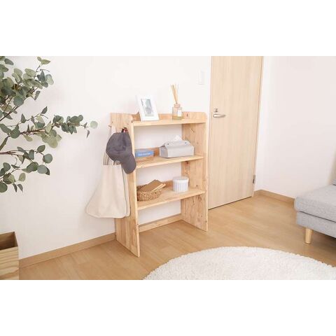 天然木の温かみが広がる壁面収納ユニットシリーズ 3段シェルフ天然木の木目や節といった個性をそのまま活かしたデザインです。横板は丸みを帯びており、優しい印象を与えます。扉がないため物の出し入れがしやすく、ボックスを使った収納アレンジも可能です。天板にはお気に入りの雑貨を飾って、魅せる収納を楽しめます。ラック側面にはバッグや帽子などを引っ掛けられるフックが付いています。高さ100cmと子どもでも使いやすく、お部屋に置いても圧迫感を感じにくい大きさです。別売りのボトムラックと合わせて収納を拡張できます。