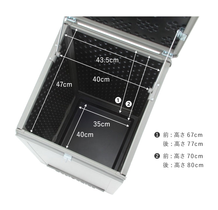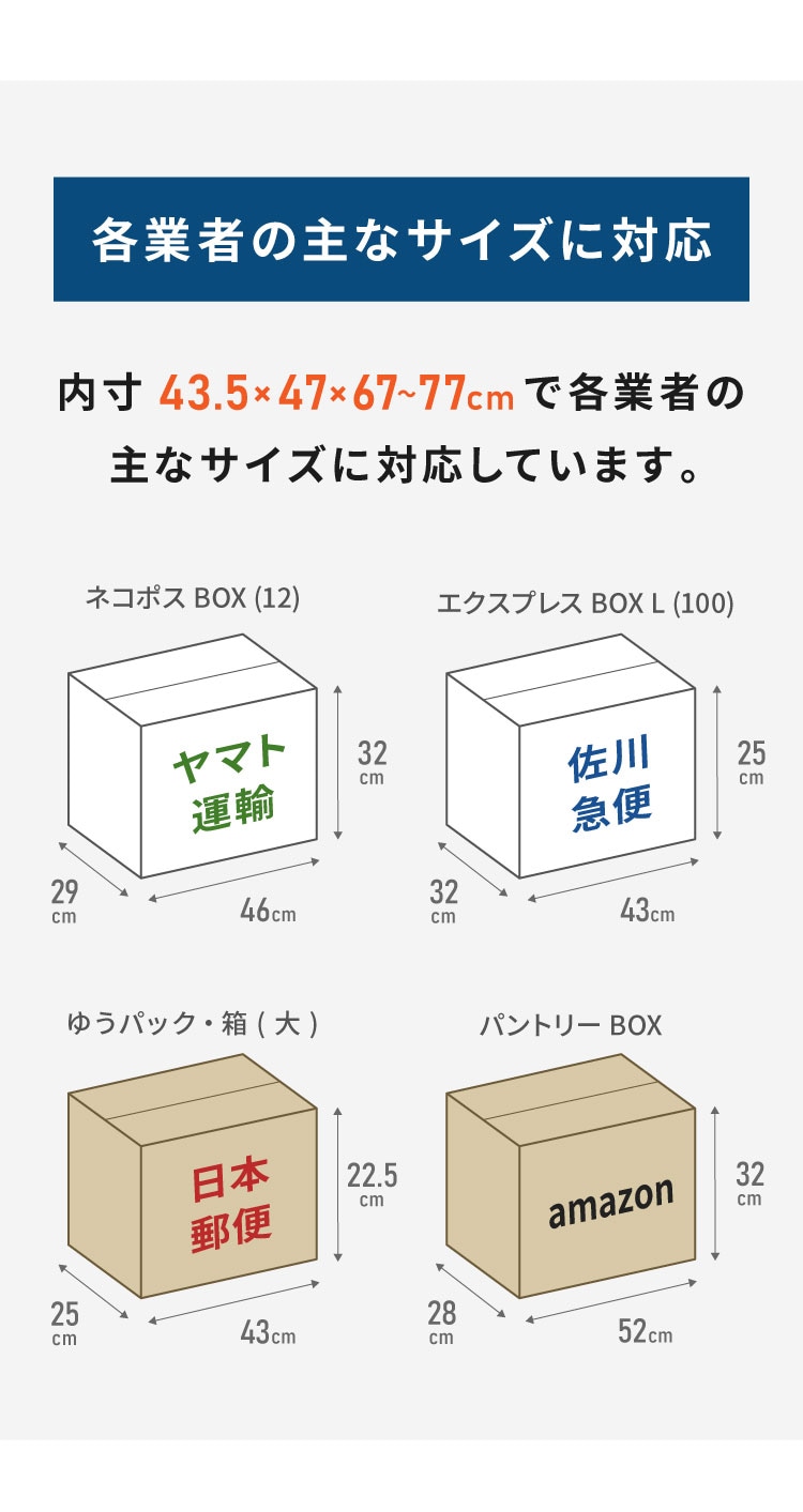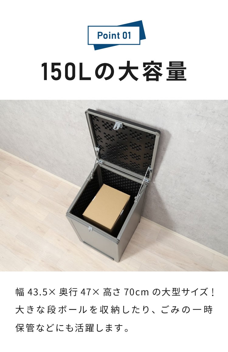 約150Lの大容量サイズ!内寸幅43.5×奥行47×高さ67~77cmと大きめなので、大きな段ボールや複数個の荷物を収納できます。