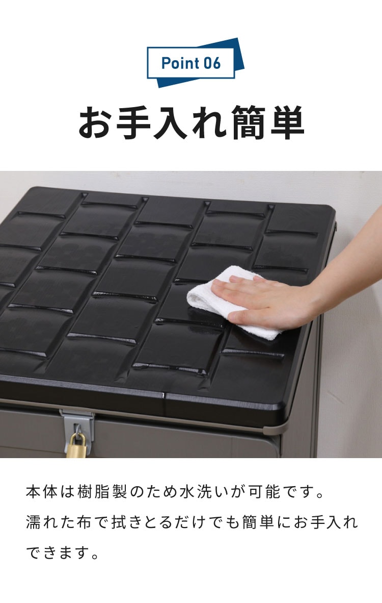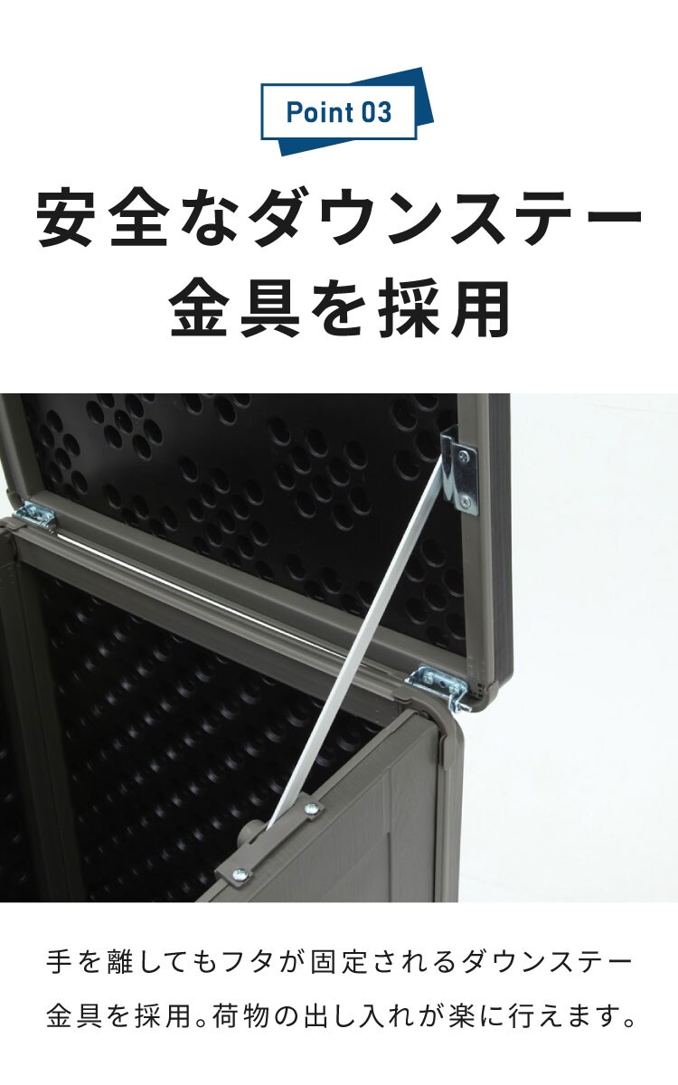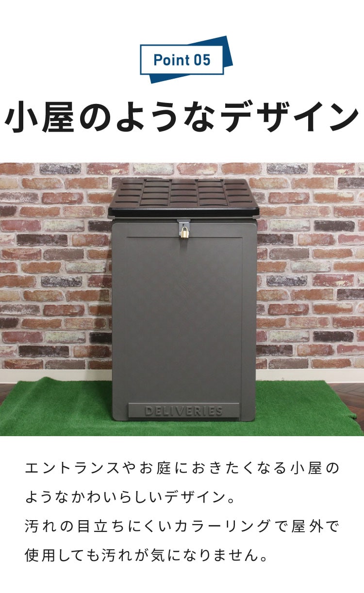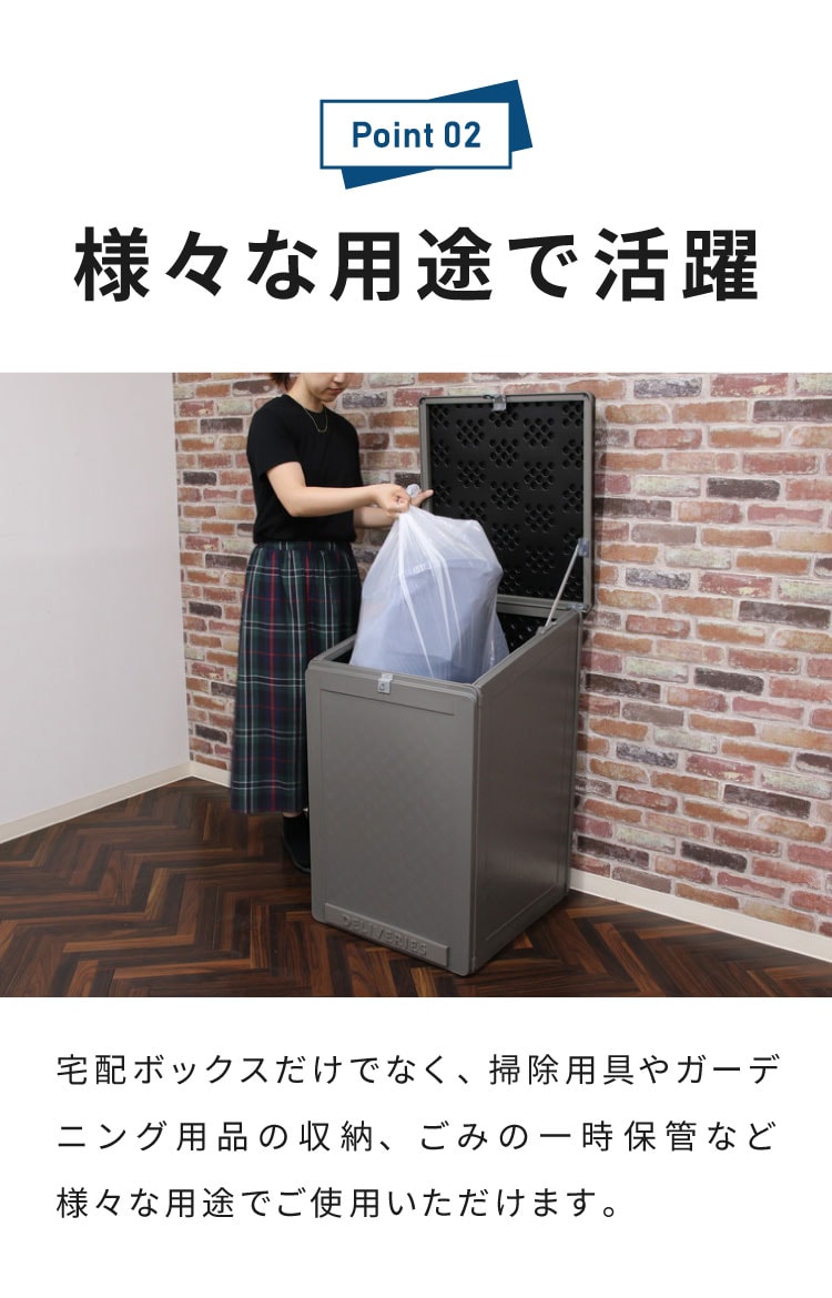 置き配の荷物ボックスや、アウトドア・スポーツ用品・ガーデニング用品などの収納、ごみ捨て日までの一時保管場所など多用途に使えます。