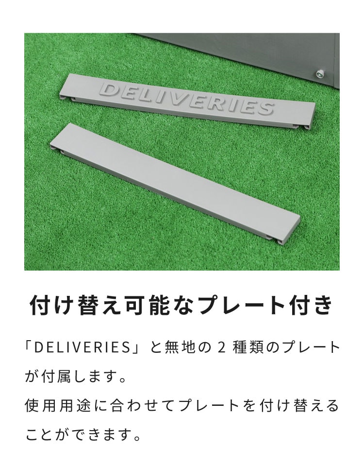 プレートには配達用(文字あり)と無地の2つがあり、無地に付け替えることで収納ボックスとしてご使用いただけます。