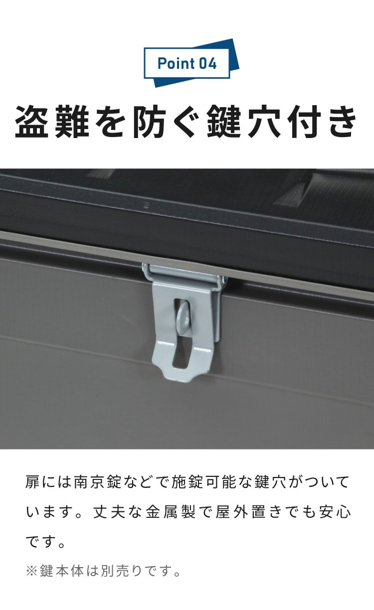 安心の鍵穴付き!南京錠などでロックが可能なパーツが前面についています。頑丈な金属製で、屋外での使用も安心です。※鍵本体は別売りになります。