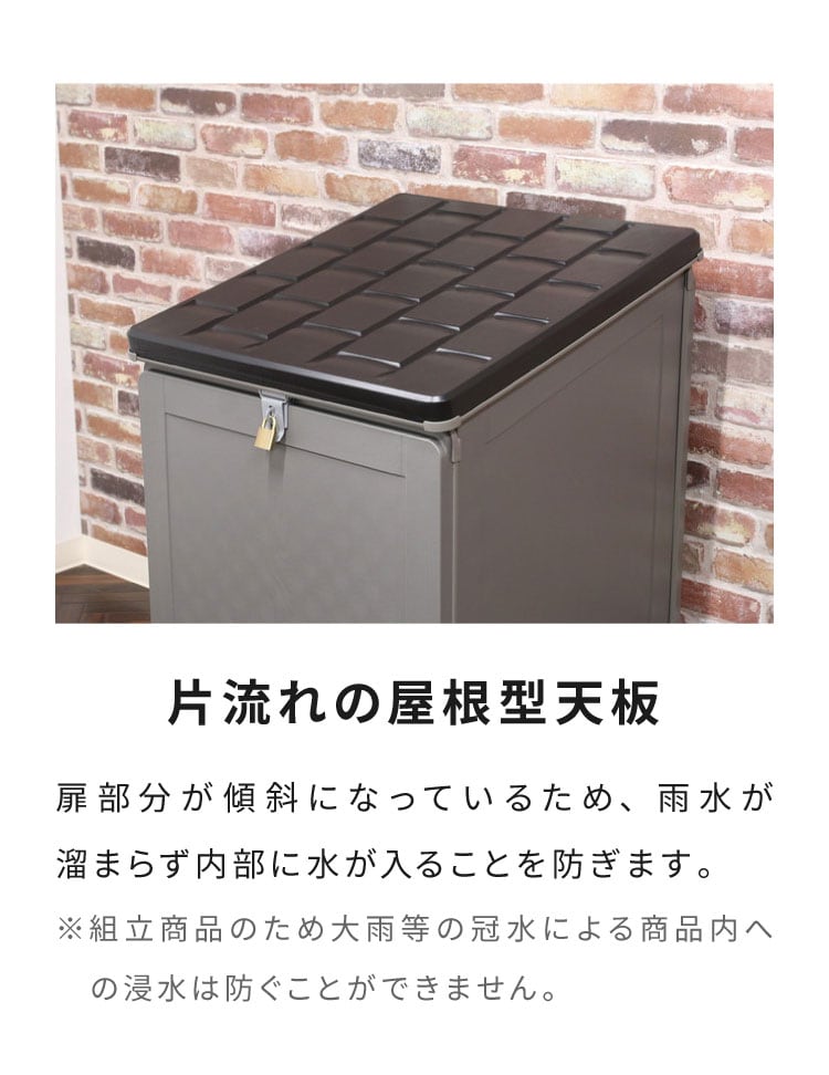 水対策のための屋根型天板。天板が斜めになっているため、雨水がたまることなく内部への侵入を防ぎます。※組立構造のため、大雨等の冠水による商品内への浸水は防ぐことができません。
