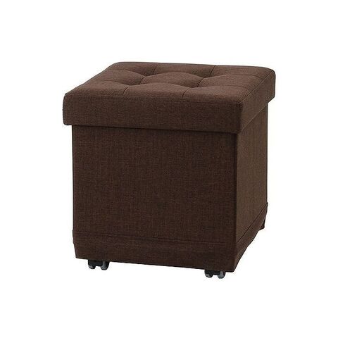 蓋を開けると中が収納スペースになっているスツールです。柔らかな印象を与えるファブリック生地を使用しております。使用時以外は折りたたんで収納することができます。底にはキャスターが付いており移動に便利です。
