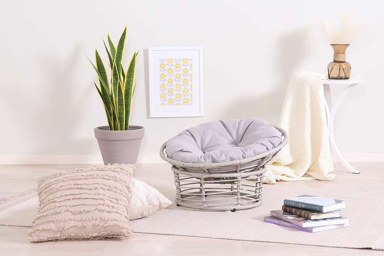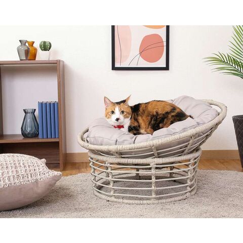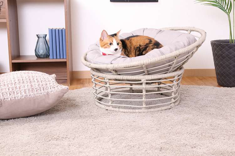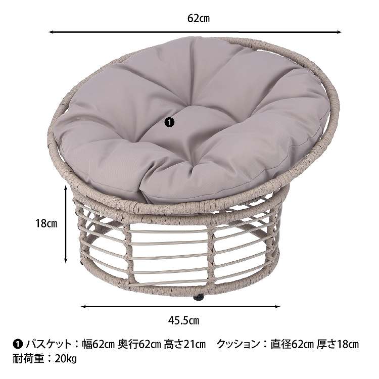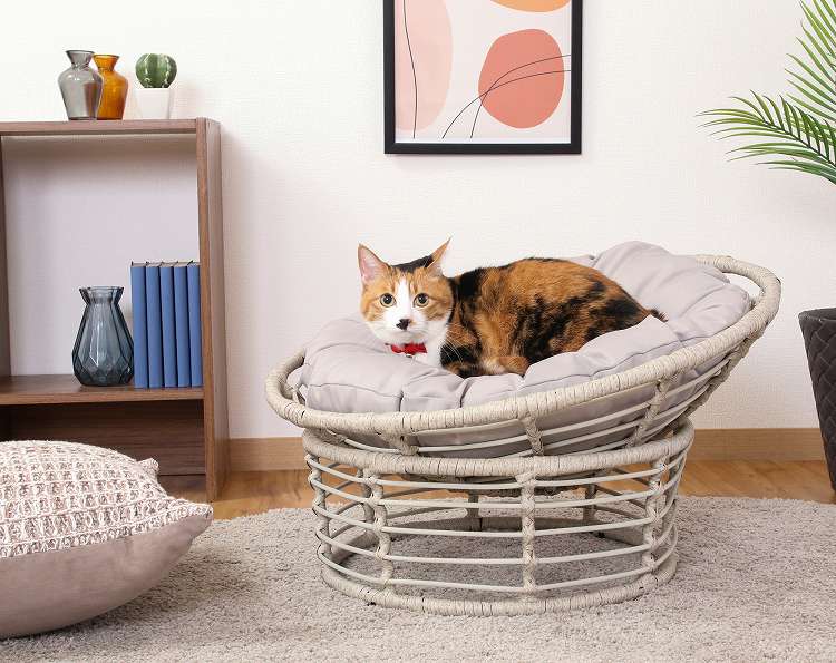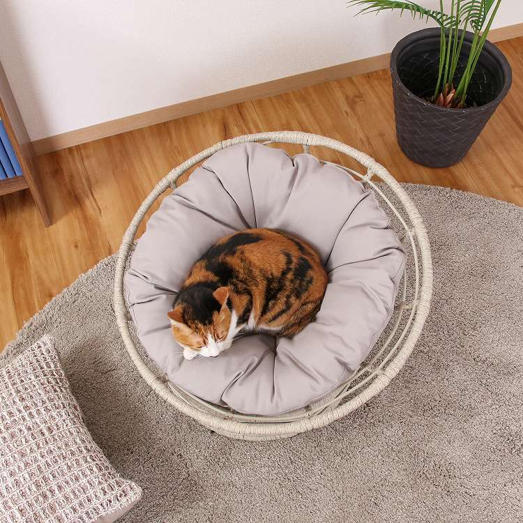 リゾート感溢れる贅沢なペット専用クッションチェアトロピカルムードを感じられるラタン調デザイン。コロンとした形でやさしくインテリアに馴染みます。座面を水平にしたり、斜めに傾けたり、使い方に応じて調整が可能です。座面は幅62×奥行21cmでゴロンと横になれるサイズ感。おやすみ用のベッドとしてもお使いいただけます。ペットにもリラックスできる場所は大切。お互いに快適に過ごせる空間をつくりだします。心地よい肌ざわりのクッションでやすらぎ時間を味わうことができます。しなやかなラインが美しいラタンは通気性もよく、隙間がチェア全体に程よい解放感をもたらします。