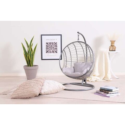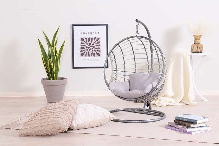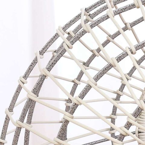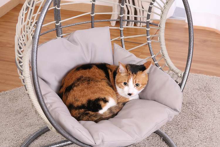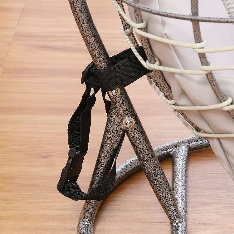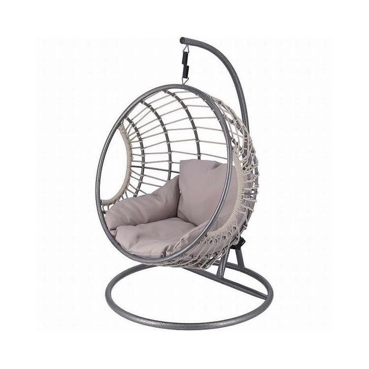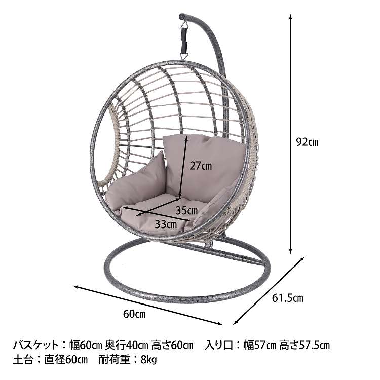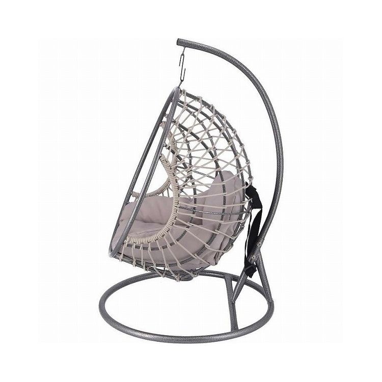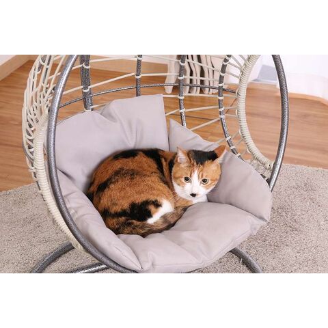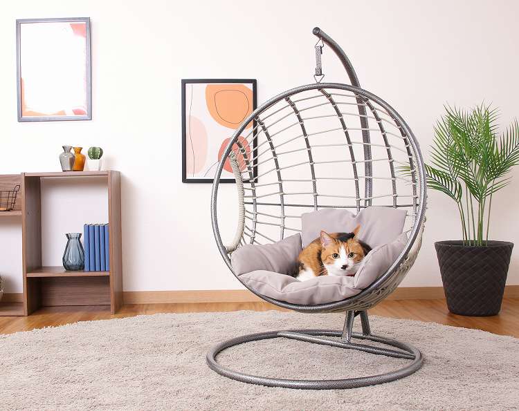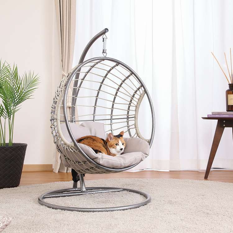 リゾート感溢れる贅沢なペット用ハンギングチェアトロピカルムードを感じられるラタン調デザイン。コロンとした形でやさしくインテリアに馴染みます。程よい揺れを楽しめるハンギングチェアはペットにとっても癒しのアイテム。専用のリラックス空間を堪能できます。ゴロンと横になれるサイズ感で、おやすみ用のベッドとしてもお使いいただけます。しなやかなラインが美しいラタンは通気性もよく、隙間がチェア全体に程よい解放感をもたらします。心地よい肌ざわりのクッションでやすらぎ時間を味わうことができます。フレームとチェアをつなぐベルトが付属。安心して揺れを楽しむことができます。