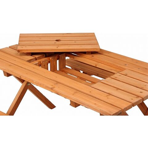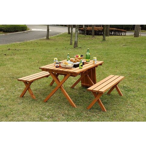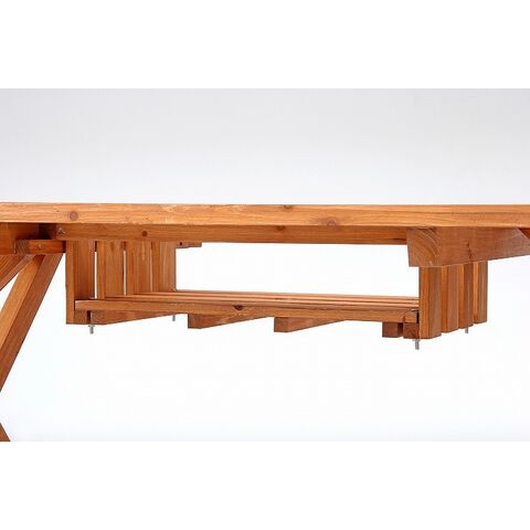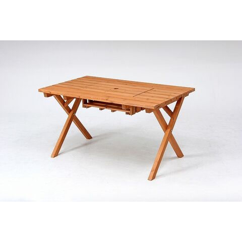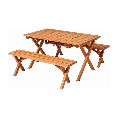 天然木を使用したあたたかみのあるテーブル&ベンチセットです。テーブルにはコンロスペース付きで、バーベキューにもピッタリです。テーブル中央にはパラソルホールがあり、パラソルと合わせて使用することができます。